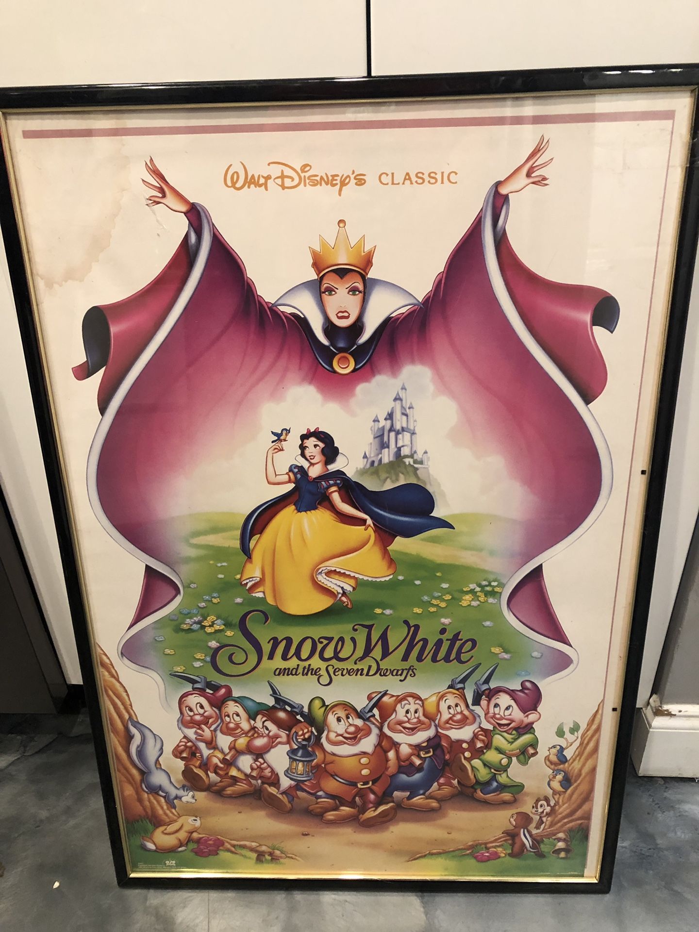 Vintage Walt Disney classic Snow White and the seven dwarfs framed picture. It definitely could be framed and a nicer better frame. Has a slight stain on the poster in the top left corner.