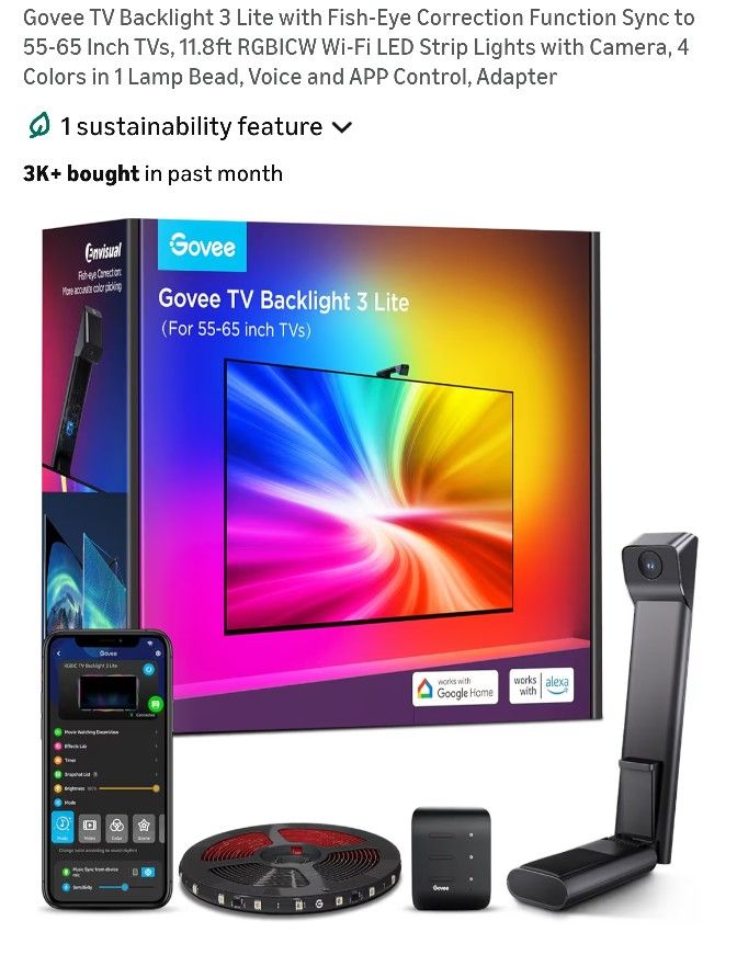 Govee TV Backlight 3 Lite with Fish-Eye Correction Function Sync to 55-65 Inch TVs, 11.8ft RGBICW Wi-Fi LED Strip Lights with Camera, 4 Colors in 1 Lamp Bead, Voice and APP Control, Adapter