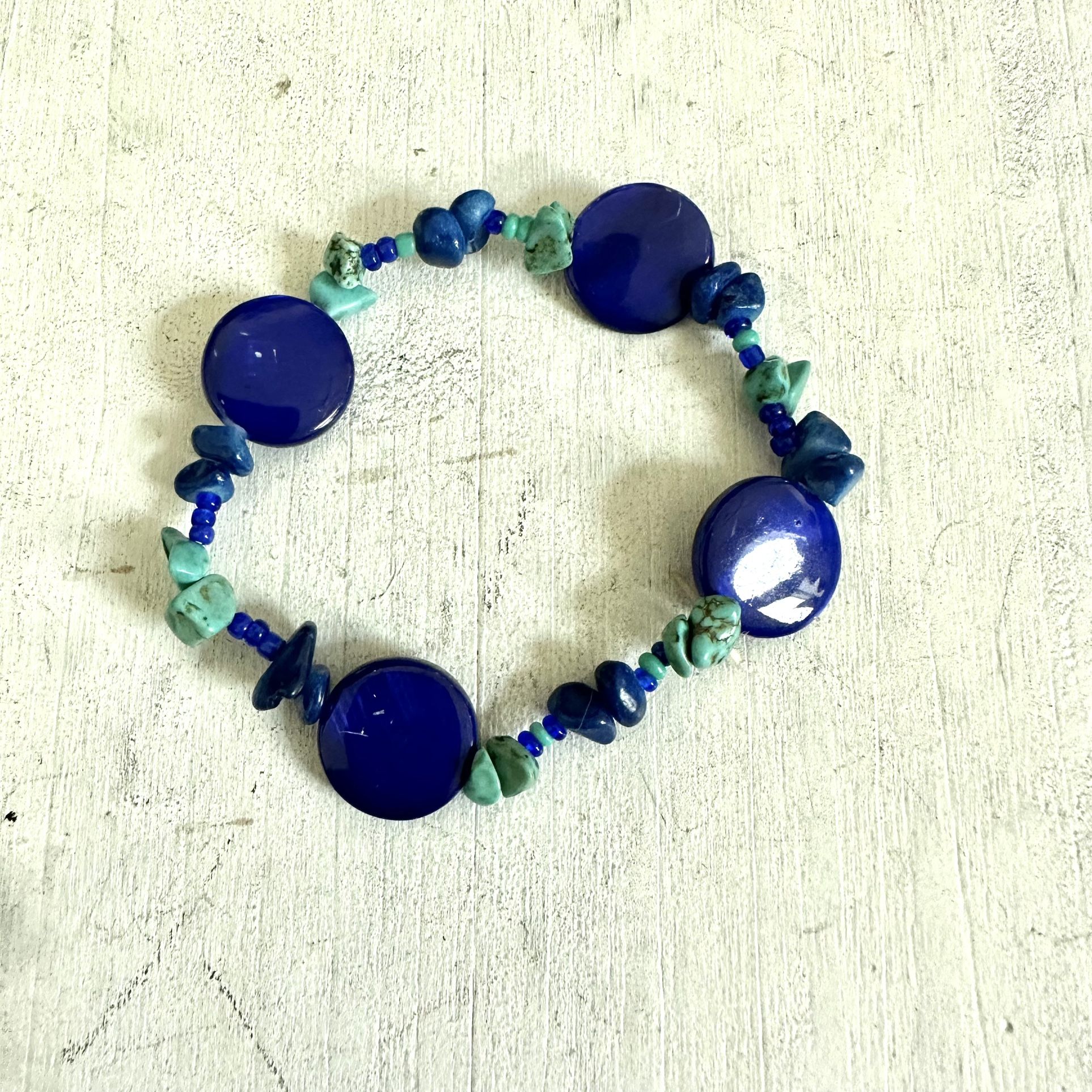 Faux turquoise Blue beads Stretchy bracelet Some of the blue beads have minor scratches Pretty alone or stacked Very open to reasonable offers - I am moving and can’t take it all with me ! Fast shipping Smoke and pet free home Bundle to save (the more you buy the bigger the discount ) Please see photos for details (they are part of the description) Happy to answer any questions Thanks for stopping by !