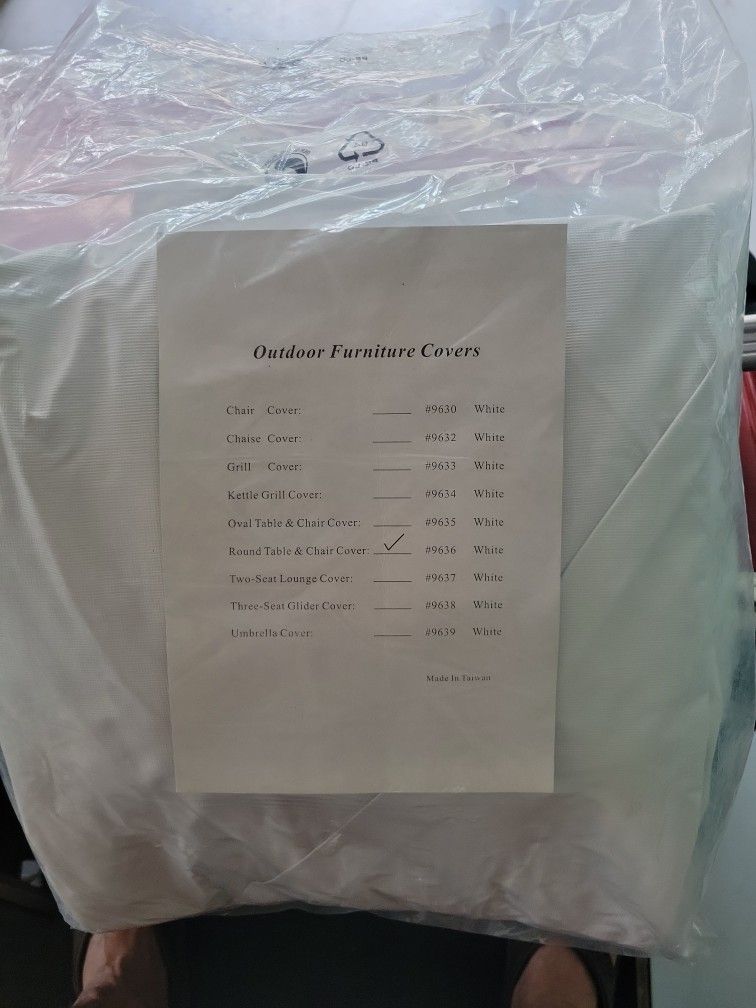 Water proof outdoor furniture covers new and still in packaging 1- for 3 seat glider or love seat 1- chair and 1- round table and chair cover $75 for all three