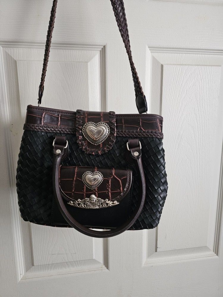 Black and brown leather western style purse with multiple pockets inside and detachable long strap for carrying with the handles. Great condition. Asking $15. PICK UP ZEPHYRHILLS FCFS