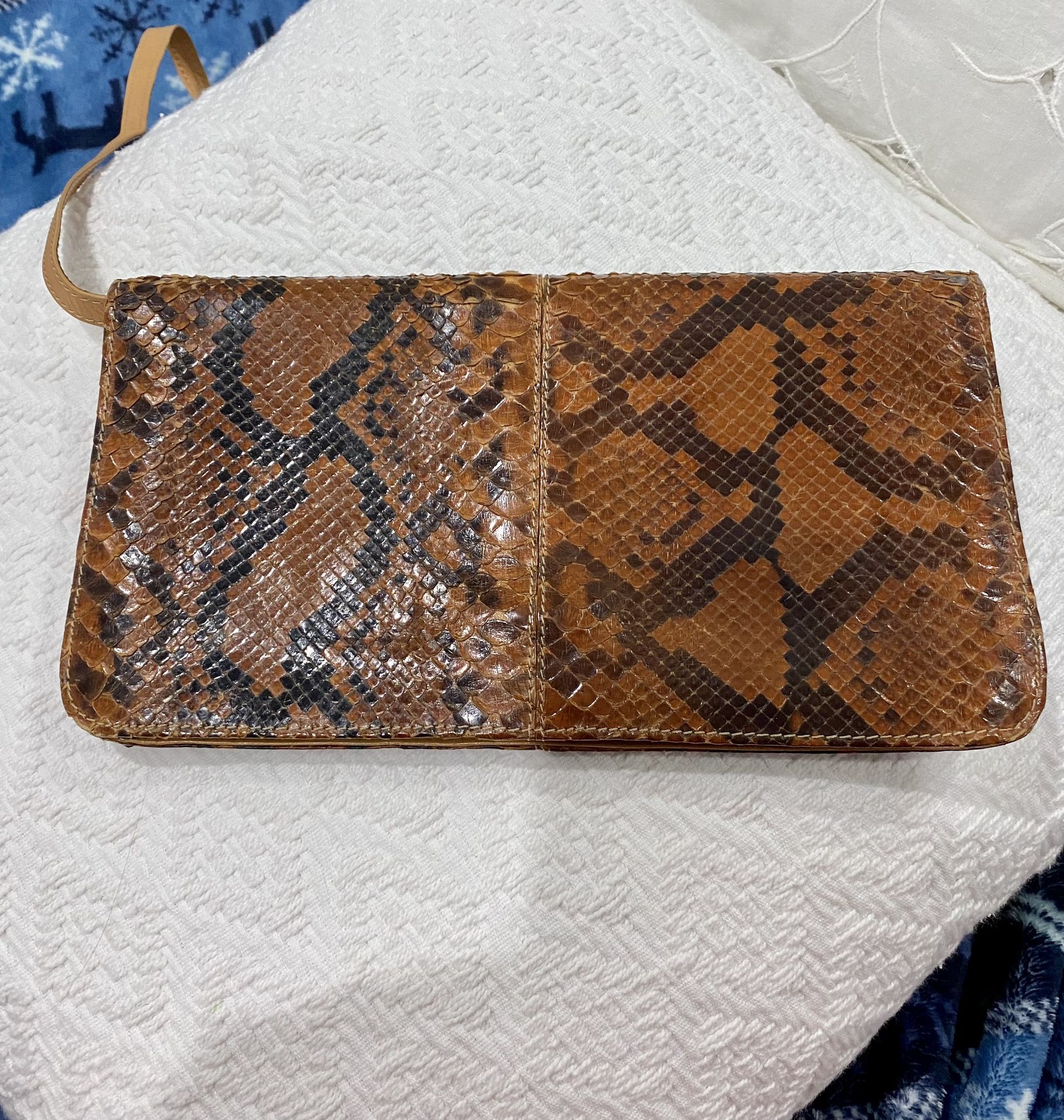 Vintage and beautiful unique and rare animal leather very soft , brown and earth tones skin small crossbody purse or clutch. Just remove handle easily and use it as a clutch or carry it on your shoulder. It’s in great conditions nothing loose damaged or broken. Very spacious inside with Teo working zippers. Inside the cover is slightly pen marked but the black interior lining is clean . Measures 10” x 5”. . Great statement piece for your outfit😉