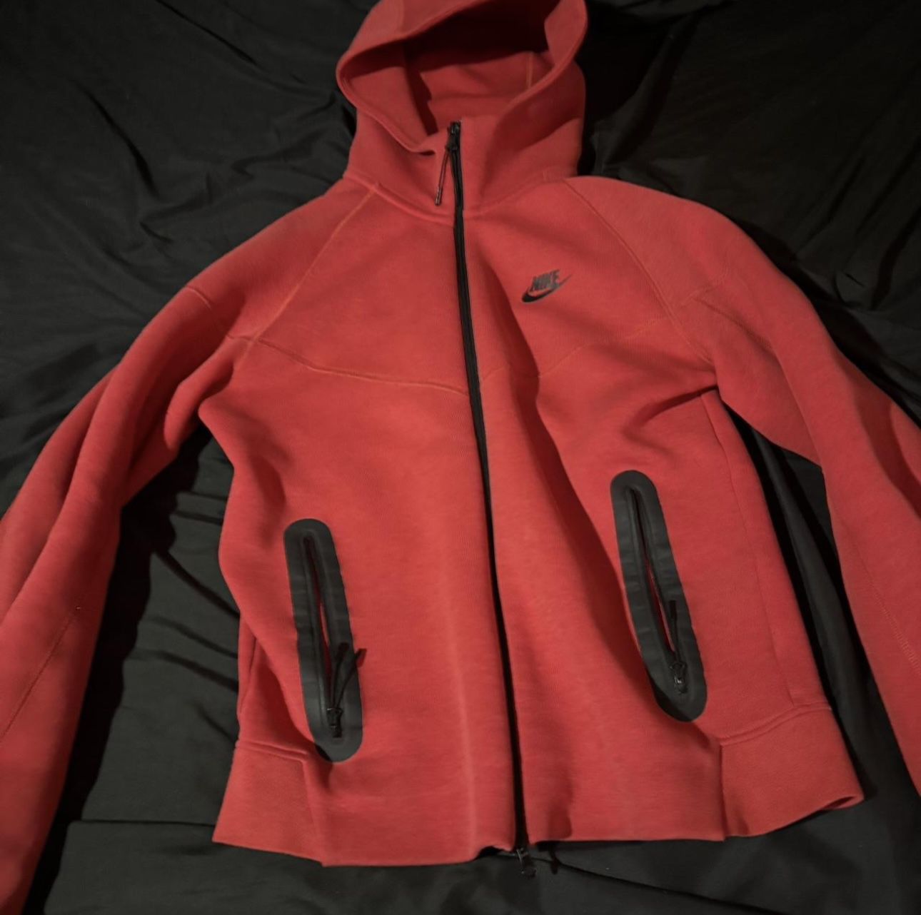 Comfy Nike Tech Fleece full zip hoodie. Has a hood and zippered pockets on the front. Red color. Good for everyday wear.