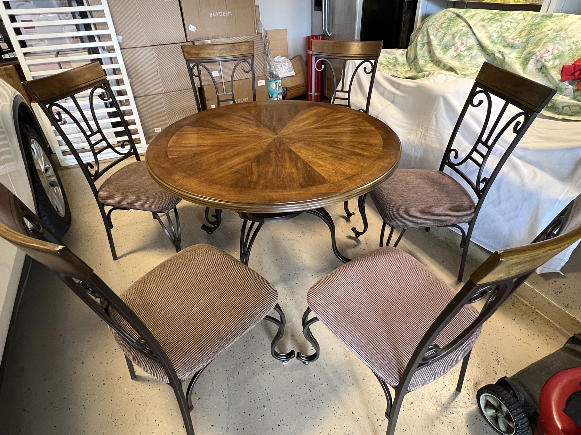 Round solid wood table with 6 matching chairs featuring metal frames.