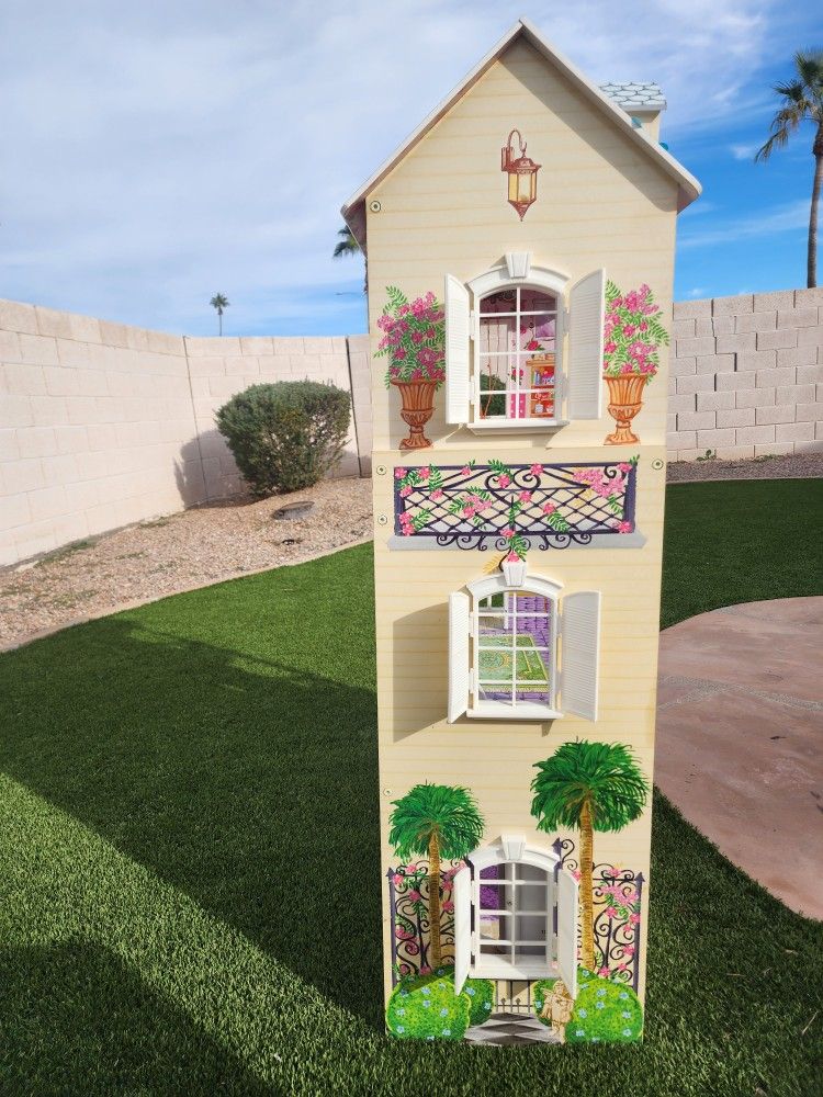 Height 4feet Width 2feet 8" Depth 13" Large Doll house The side entrance door for the bottom of the house needs to be fixed.