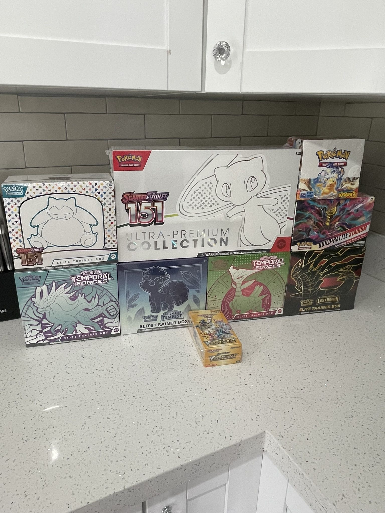 Everything is brand new and sealed. Prices below! Open to trades in my favor at 85% 151 etb $400 151 UPC $660 Surging sparks booster box $300 Lost origin etb $150 Lost origin build battle $190 Temporal forces etb $75 each Vstar universe box $125 Silver temptest etb $100 Prismatic evolution pokemon center ETB $425