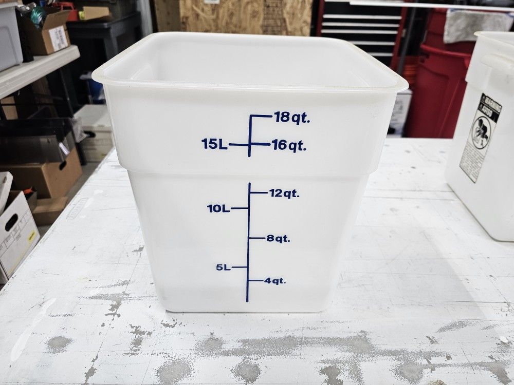 I have 4 of these for $30.00 Square Shape The square shape provides 33% better space efficiency than round containers, allowing you to minimize your storage footprint, while the square corners ensure precise pouring without spilling a drop! Stain-Resistant Plastic This food storage container is made of BPA-free white polyethylene that provides excellent resistance to impact, staining, and chemicals. It won't be stained or harmed by food acids, oils, or alcohol. Versatile Temperature Range This square container can withstand temperatures ranging from -40 to 210 degrees Fahrenheit. This ensures that it is safe for use in refrigerators and freezers, and when cleaning in a dishwasher. Measurement Graduations Large, easy-to-read measurement graduations listed in both quarts and liters allow you to manage your inventory at a glance. The markings have a distinct midnight blue color that stands out on the white container Cambro 18SFSP148 Specs Quantity 1/Each Shipping Weight 2.17 lb. Length 11 1/4 Inches Width 12 1/4 Inches Height 12 5/8 Inches Capacity 18 qt. Color White Features BPA Free Dishwasher Safe Freezer Safe Made in America Measurement Guides NSF Certified Material Polyethylene Product Line Cambro CamSquares® Shape Square Type Containers Other Products from this Line