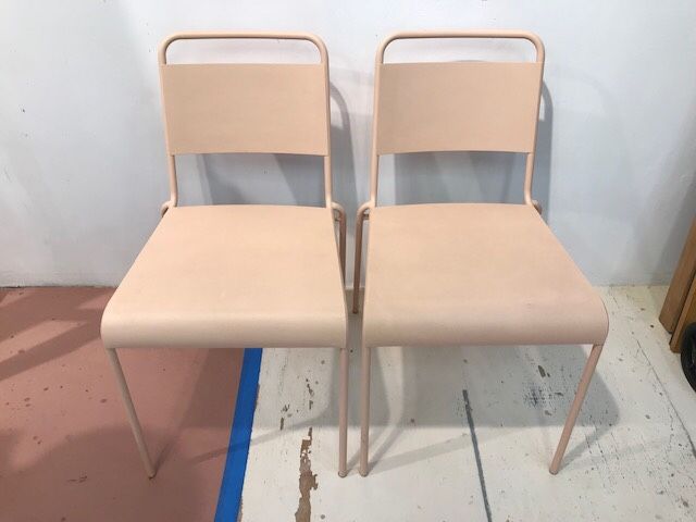 Pair of Blush Metal Stacking Chairs For Indoor Or Outdoor Use