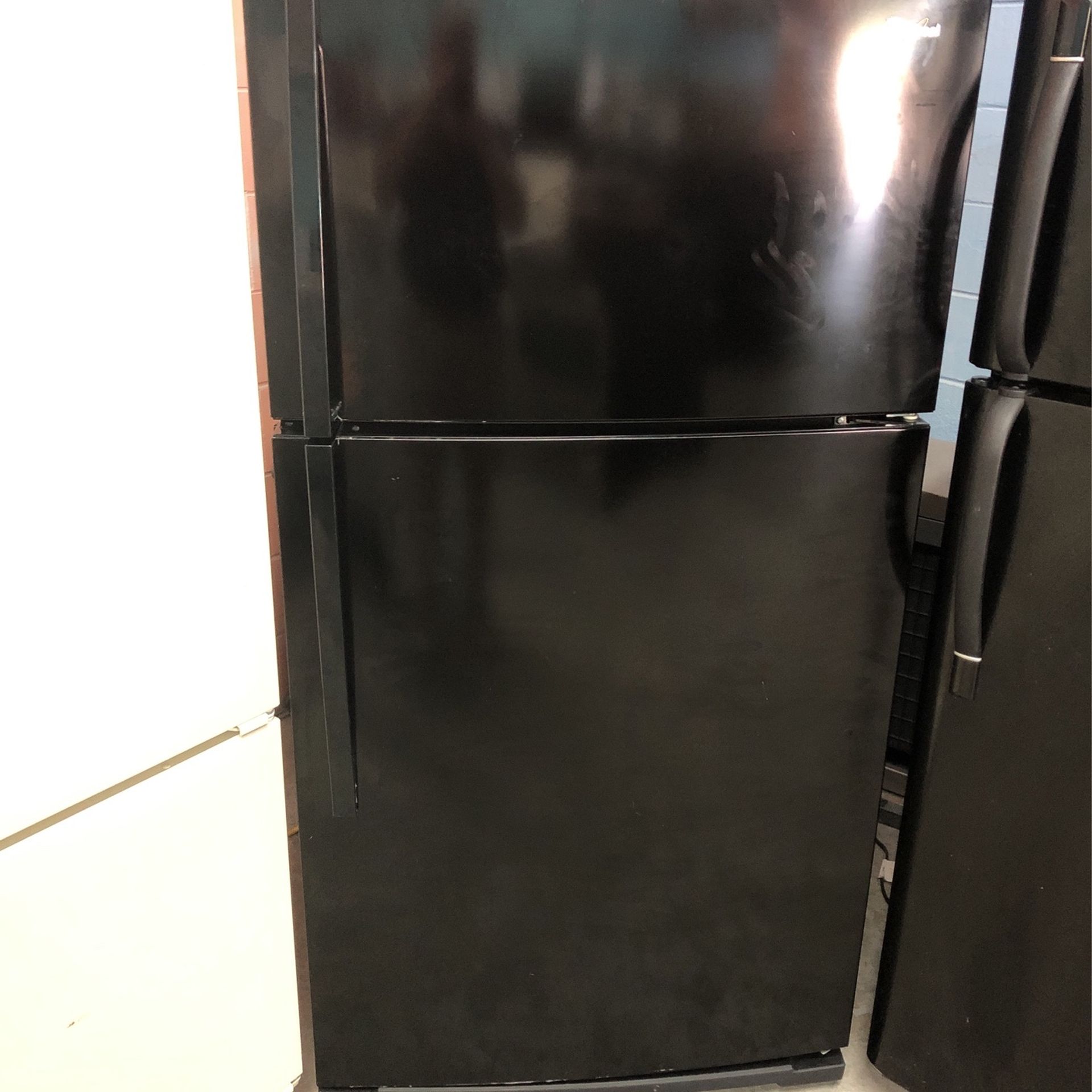 Whirlpool 22 cubic foot black refrigerator with ice maker. Food section has adjustable full width spill proof glass shelves full width deli draw 2 crispers and adjustable gallon size door bins. Freezer has full width spill proof glass shelve 2 door shelves and ice maker. Refrigerator is plugged in and running. Comes with 120 day warranty. Financing and delivery available.