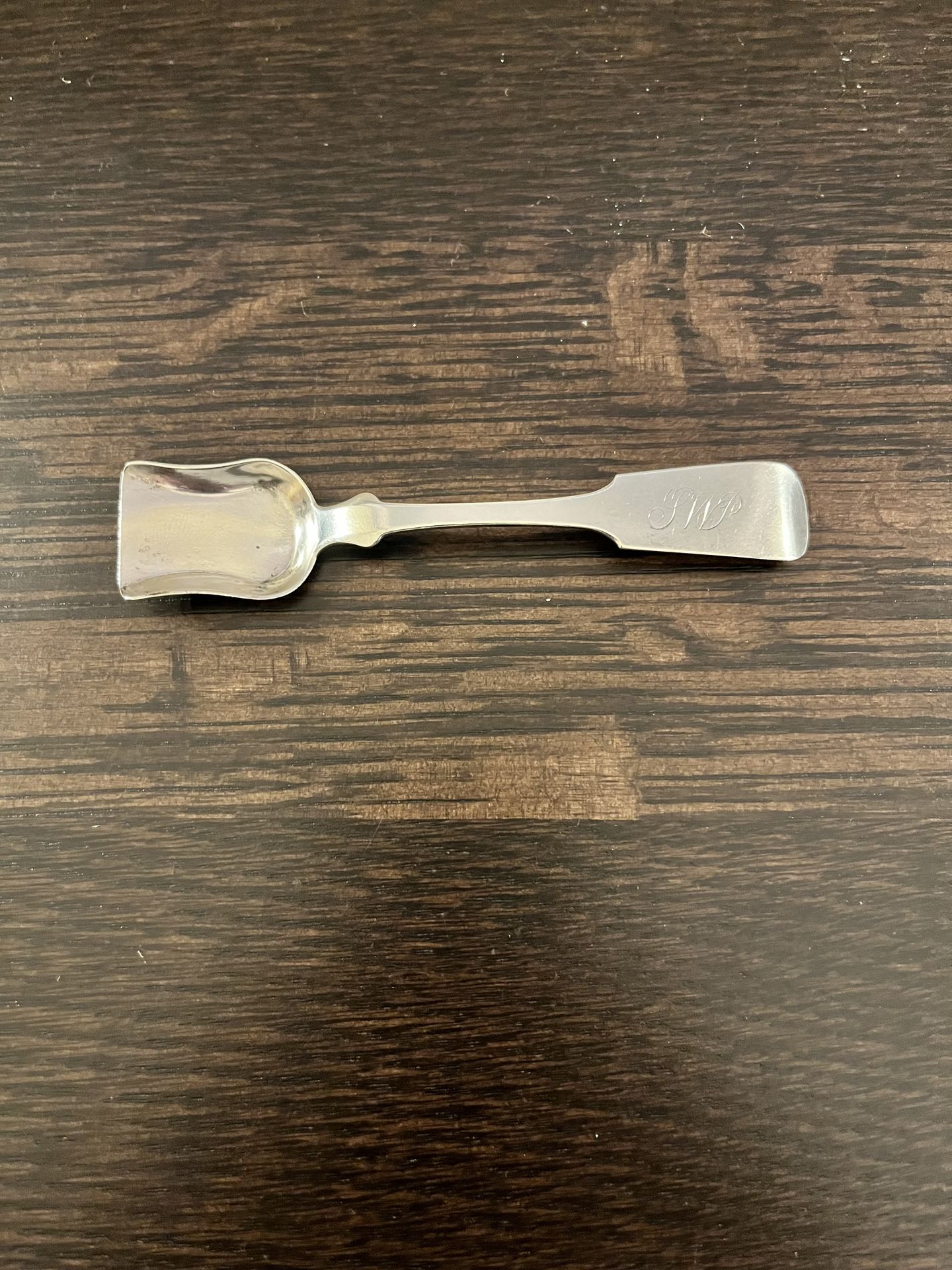 Likely an American coin silver sugar shovel or salt spoon, likely dating from the early-to-mid 19th century. Crafted from coin silver, which typically predates the widespread use of sterling silver in the United States. Features a distinctive shovel-shaped bowl and a monogrammed fiddle-pattern handle. Marked manufacturer with letter "D" flanked by two stars would have been used to identify the silversmith. Composition: Coin silver is generally composed of \(90\%\) pure silver, Good condition Approximate dimensions Saucer 4.2" long x 0.9" wide Approximately 8.5 grams weight