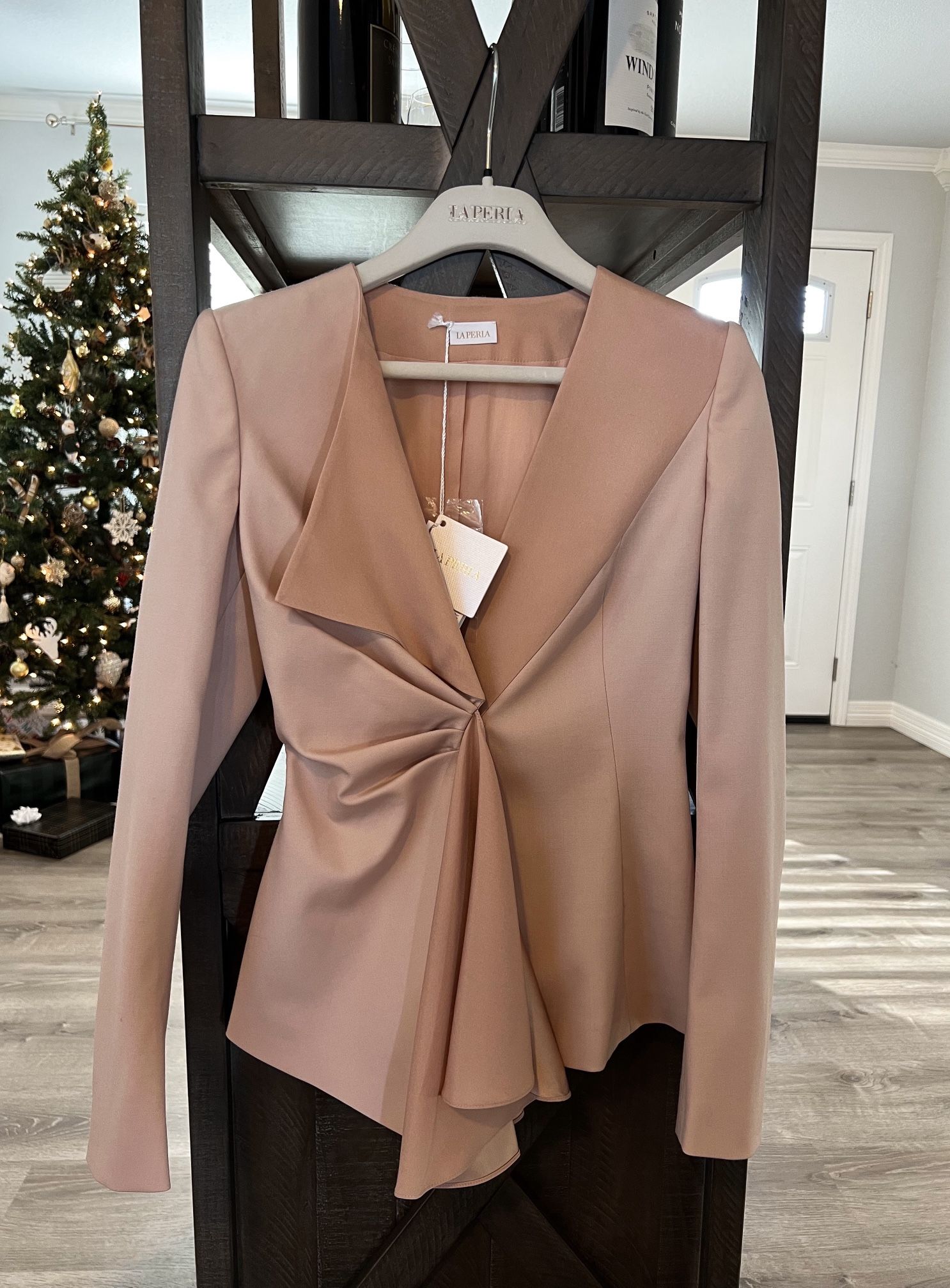 NWT | La Perla | Blush virgin wool asymmetrical flared jacket | RARE FIND I got this jacket years ago and it’s too small for me. :( Time to find a new home! This blazer has NEVER BEEN WORN, was never used, has zero blemishes, and it still comes with the original tag. It has been well taken care of and the fabric feels amazing to the touch. The La Perla hanger and La Perla cloth garment bag are included. The garment bag has a few minor blemishes but it has done a great job keeping this blazer immaculate. Fabric: Virgin Wool & Silk. Remove any wrinkles with a fabric steamer on delicate mode. Original Price: $1960 (yes m’am)