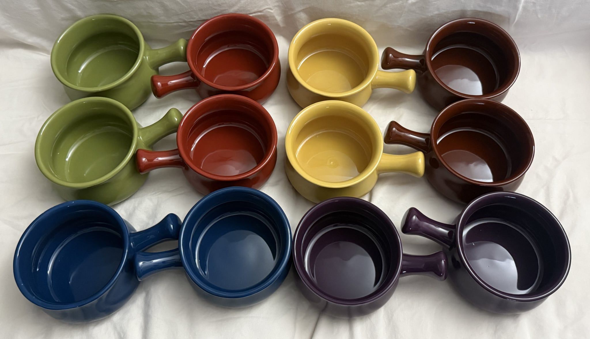 have 8 total 2 of each color (green-SOLD, red, yellow-SOLD, brown, purple, blue) Overall 7 1/4" W x (opening) 4 1/4 x 3 T Oven, microwave, freezer and dishwasher safe $6 per bowl