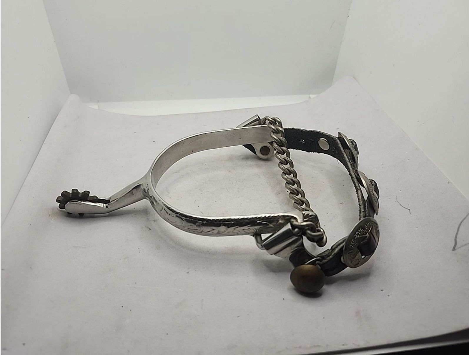 Ladies Floral Engraved Stainless Western Rowel Spur w/ Leather Strap Single