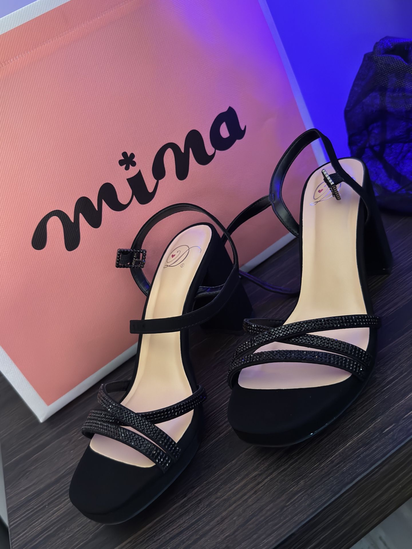 Brand new, never worn. Women’s black heeled sandals by Mina, size 7. Purchased but couldn’t return. Elegant rhinestone strap design, block heel, very comfortable. Perfect for parties, weddings, or special occasions.
