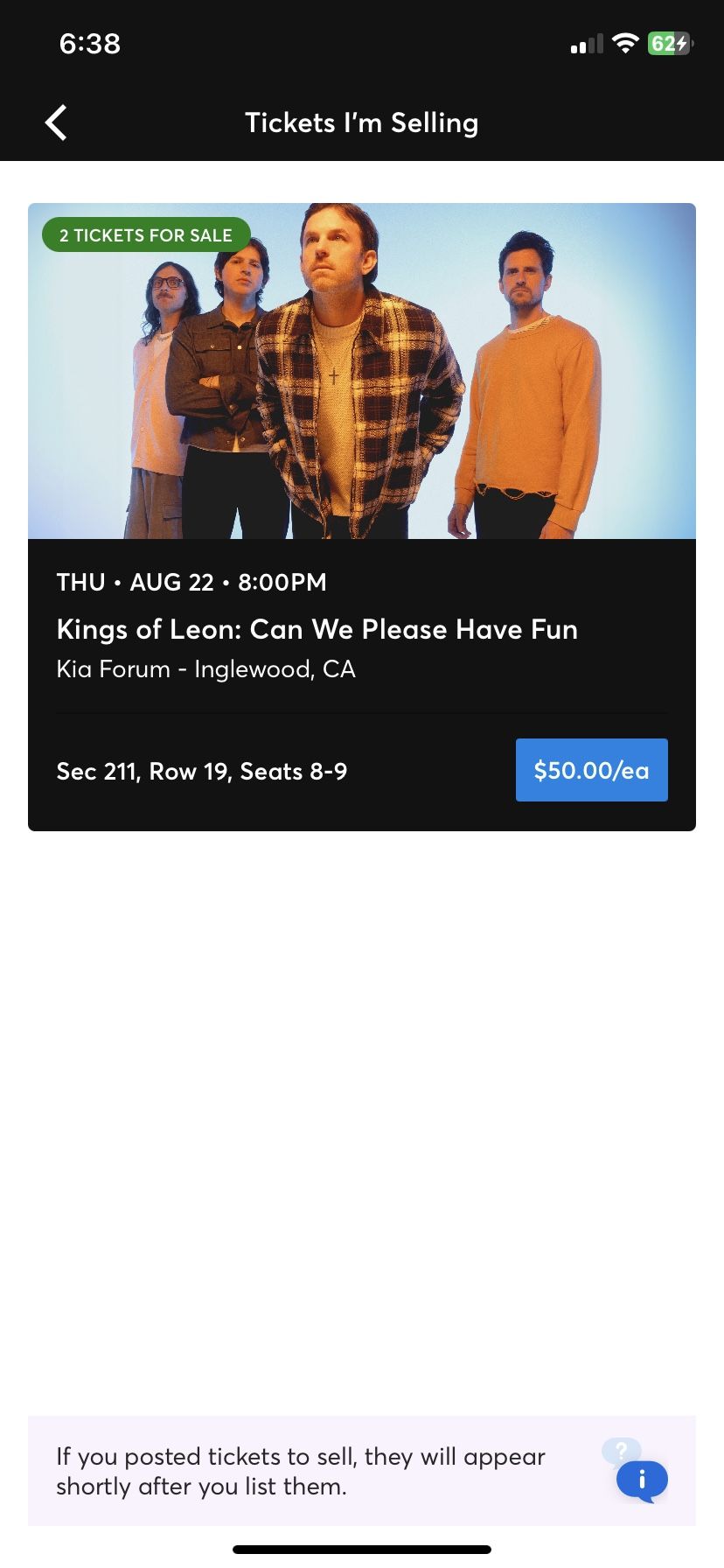 2 tickets for $100 Sec 211, Row 19, seats 8-9 I’ll transfer them on Ticketmaster