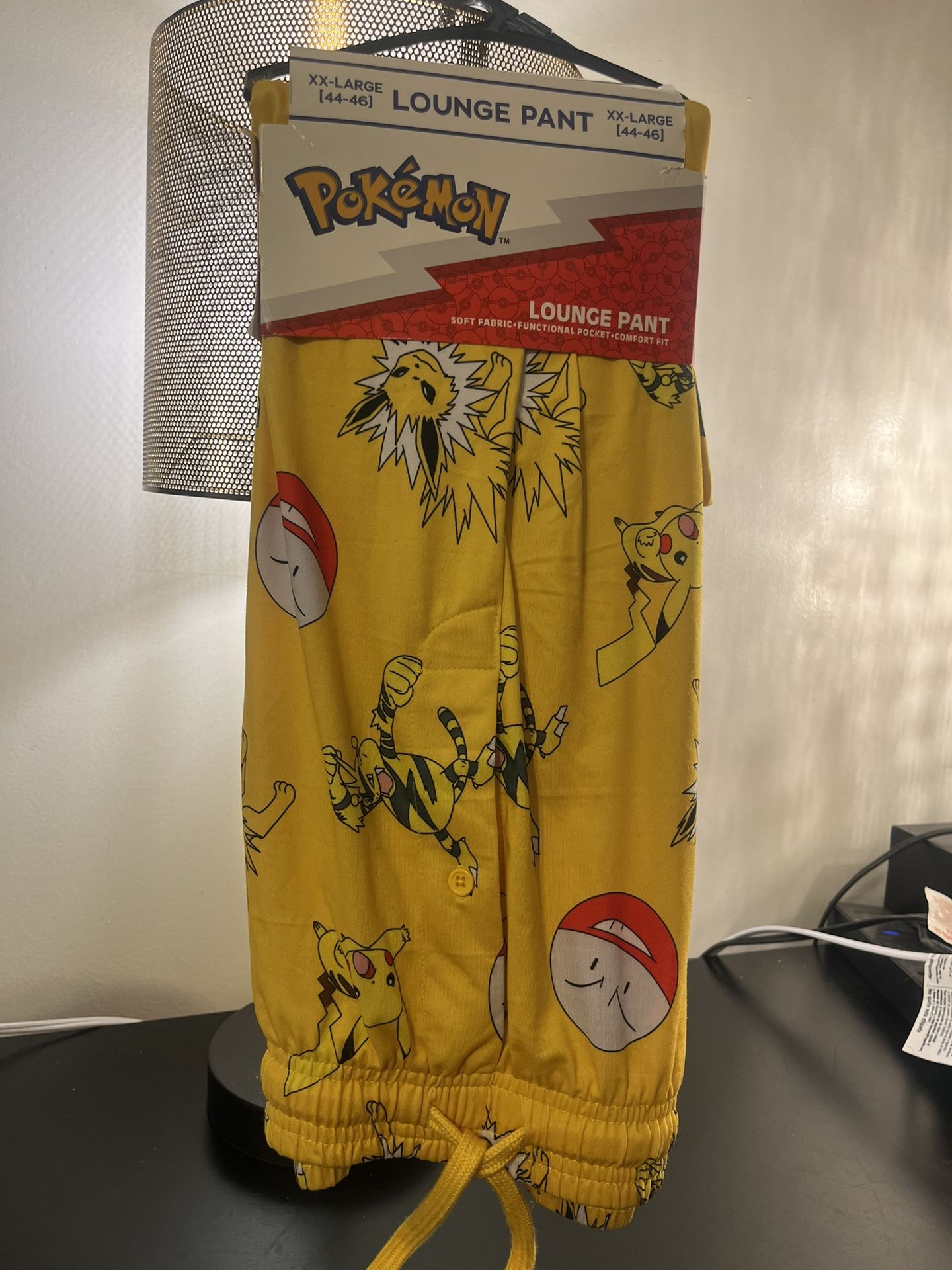 These are Mad Engine Pokémon lounge pants. The yellow pants feature an all-over print of the electric-type Pokémon Pikachu and Jolteon. They are designed for adults, made from a soft blend of polyester and spandex, and include functional pockets and an elastic waistband with a drawstring closure. Product Details Brand: Mad Engine Theme: Pokémon, featuring Pikachu and Jolteon Material: 92% polyester and 8% spandex blend for a soft and stretchy feel Features: All-over print design, elastic waistband with an adjustable drawstring, and side pockets Intended for: Men/Adults, but suitable for all older fans
