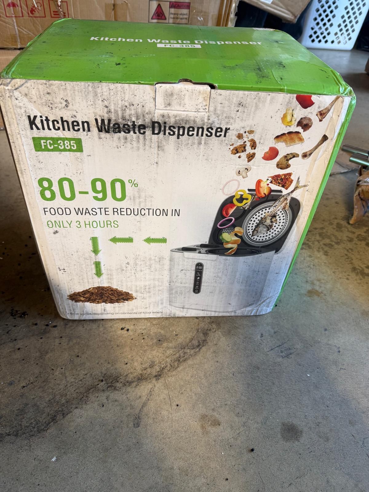This FC-385 Kitchen Waste Dispenser is a compact food waste processing unit designed to reduce household food scraps by 80–90% in as little as 3 hours. It features a 4-liter large capacity interior and includes grinding and drying technology to break down food waste efficiently. Key features highlighted on the packaging include ferment mode, double deodorization, smart touch display, and automatic cleaning for convenient and odor-controlled operation. The unit helps transform food scraps into dry, reduced waste material, making it ideal for eco-conscious kitchens.