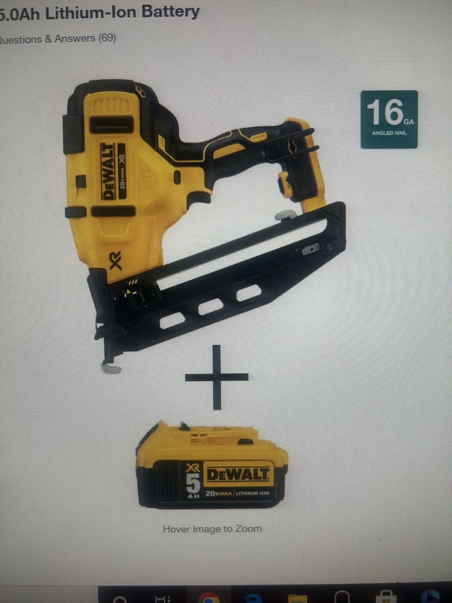 DeWalt cordless finish nailer gets job done without hassle, noise or weight of a compressor 16 gauge angled finish nails of 1 1/4 inch to 2 1/2 inch length comes with battery, never used