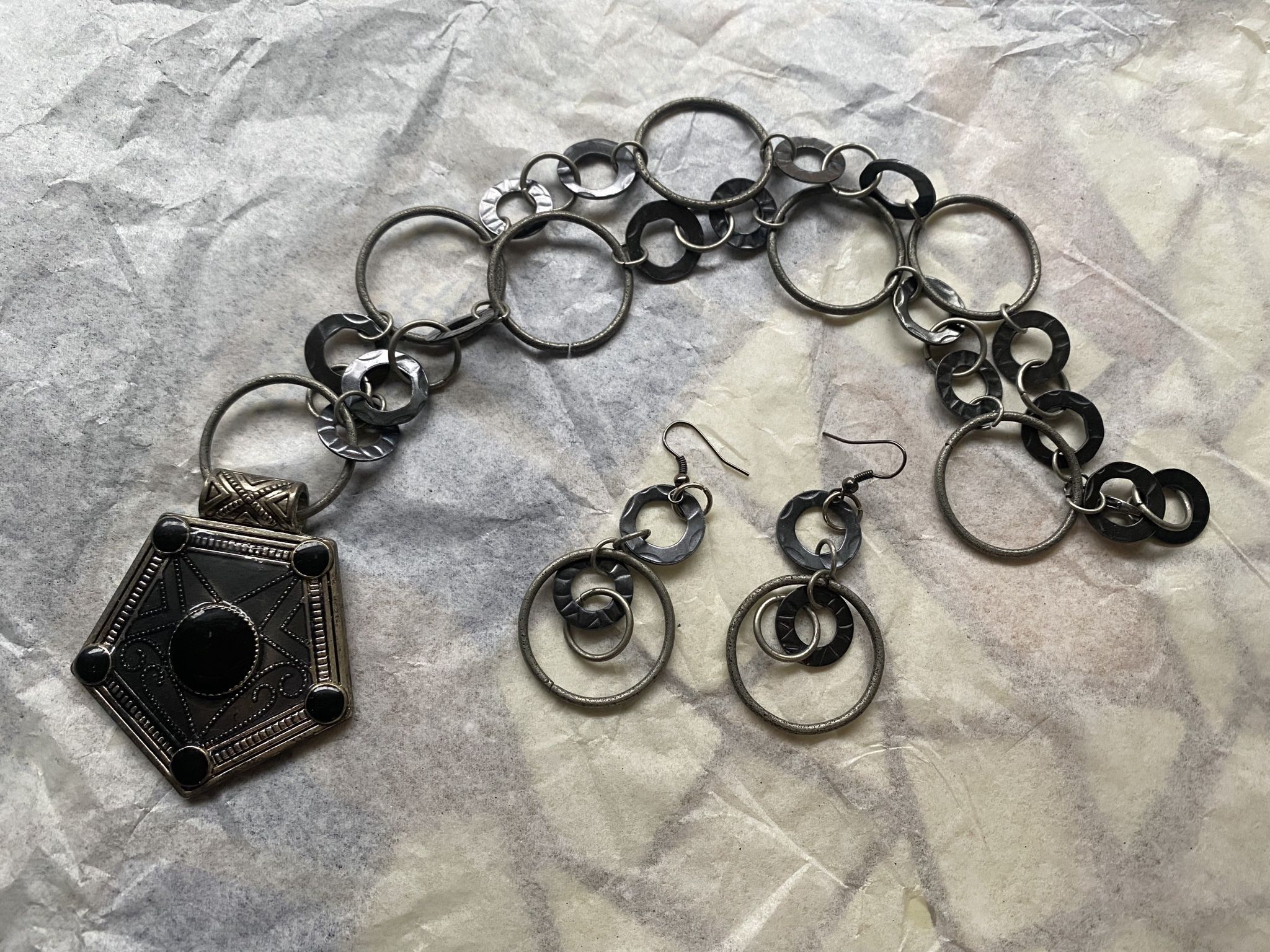 Gothic Black Stone Pewter Hexagon Pendant Ring Chain Necklace & Earrings Set Good used condition. Chain rings show some light tarnishing/wear. Pendant measures 2" x 2". Chain drop measures 10". Each earring measures 2.5" long.