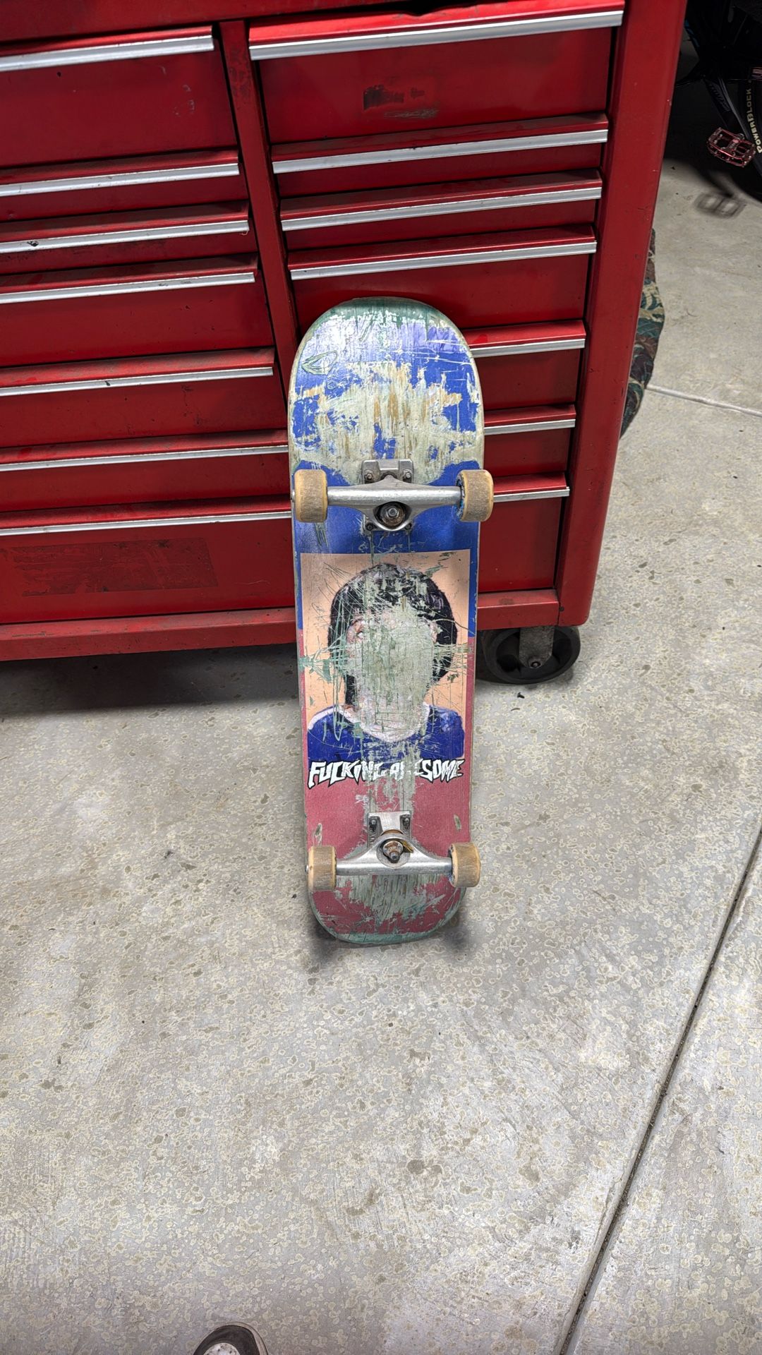 Has INDEPENDENT TRUCKS SPITFIRE FOUR WHEELS Not in best condition but runs good feels good need to get rid of it :/