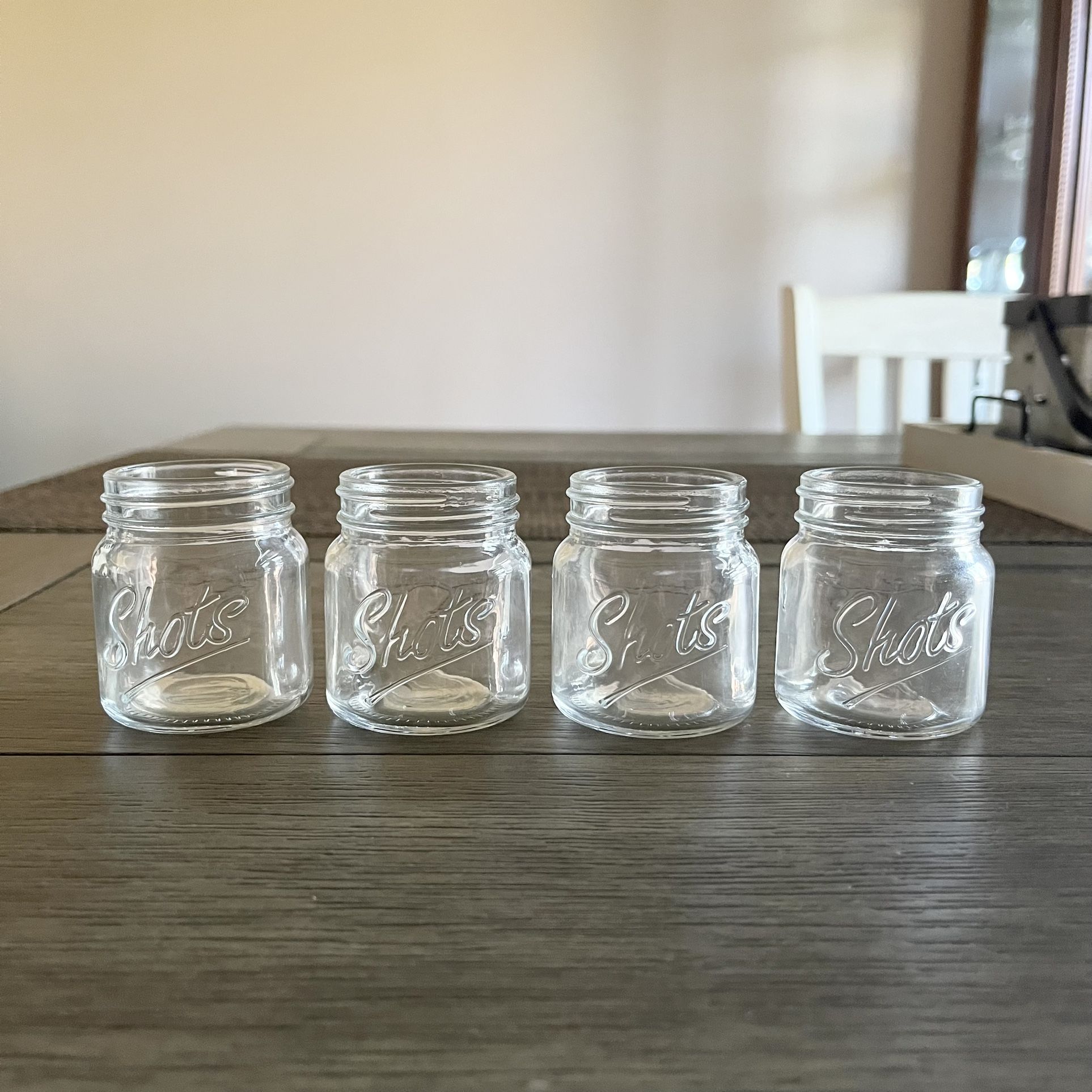 Set of 4 mason jar style shot glasses Brand new, received as a gift but never used Cash only please Pickup at my home on Vicksburg Drive in Parma or from my office in the Middleburg Heights/Strongsville area No shipping available