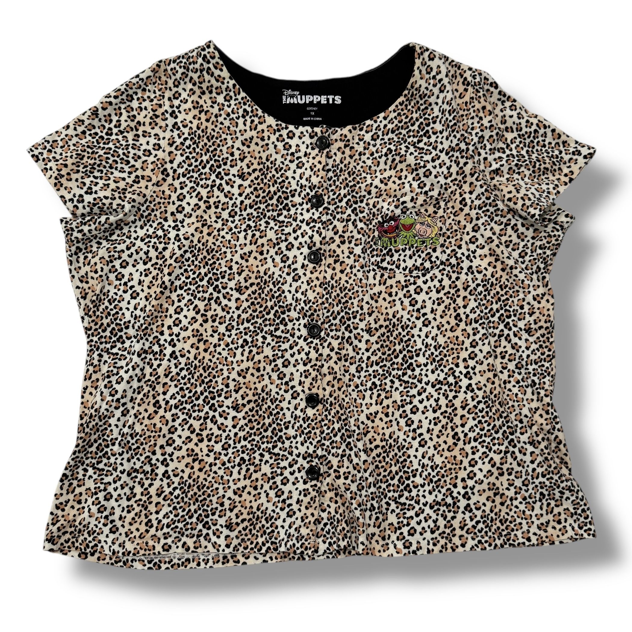 MUPPETS Leopard Print Button Down Embroidered Kermit Top Lounge Sleep Wear 1X This MUPPETS Leopard Print Button Down Top in size 1X is a casual and comfortable lounge sleepwear for women. The top features a round neck, short sleeves, and a classic short sleeve, making it perfect for the warmer seasons of summer, fall, and spring. The black and beige color scheme with leopard print adds a playful and whimsical touch to the design, while the embroidered pocket enhance the overall look. Made from cotton fabric, this blouse from The Muppets and Disney brand is a fun and unique addition to any wardrobe, suitable for heading to Disney Parks or California Adventures or relaxed casual outings. 24” shoulder to bottom 24” across underarms