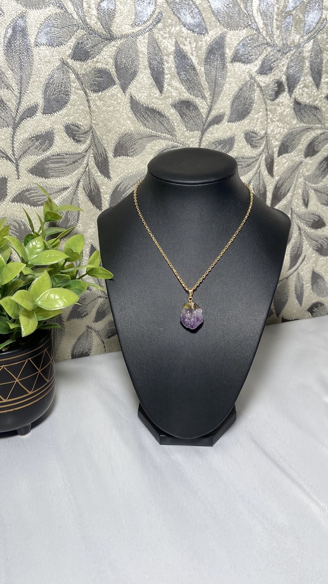 Features of the stone - natural purple amethyst - 18k gold plated chain - chain measurements can be seen in the photo. Amethyst is a powerful and protective stone, known for its calming energy. It enhances spiritual awareness and intuition, promoting clarity of thought and emotional balance. Amethyst is associated with the crown chakra, facilitating a deeper connection to higher realms and promoting meditation. It is believed to alleviate stress, anxiety, and negative thoughts while encouraging inner peace and tranquility. Many use amethyst for emotional healing, fostering compassion, and supporting personal growth. Chevron Amethyst (pendant), also known as Dogtooth Amethyst, combines the properties of both amethyst and quartz. Its distinctive banding enhances the protective qualities of regular amethyst while amplifying spiritual awareness. Chevron Amethyst is said to aid in accessing higher consciousness, improving intuition, and enhancing meditation practices.