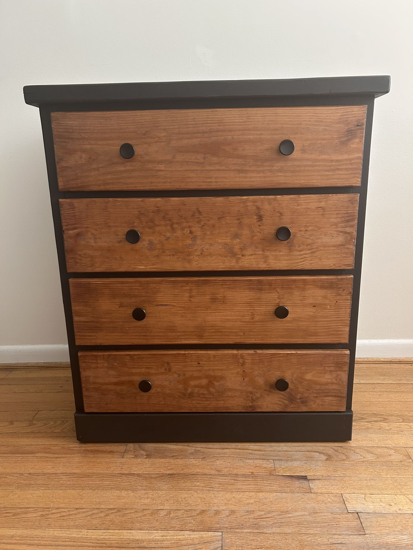 Solid wood, refinished with black paint and walnut stain, new hardware. Dimensions: 37” height, 33” width, 18.5 depth