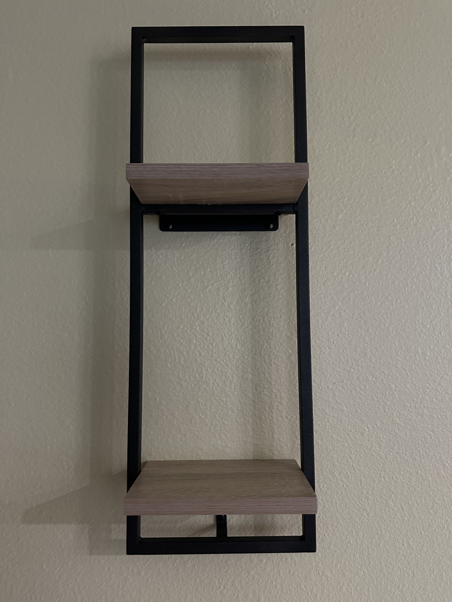 Two-2 Tier Vertical Floating Wall Shelves. Black metal frame with wood shelves. No scratches. Non-smoking home. Clock & decor items not included. Dimensions: 8.1”L x 4.9”D x 23.6”H