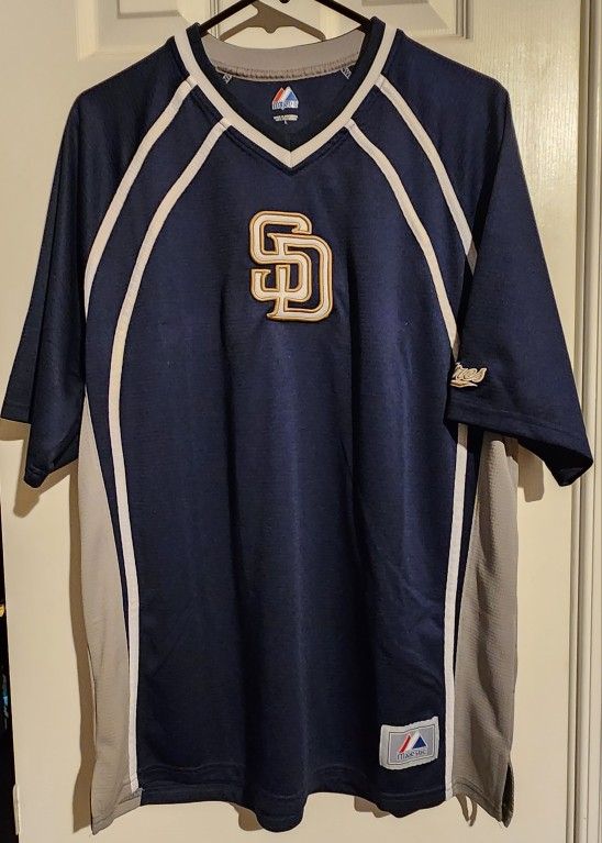 Padres Jersey by Majestic, Size Large Barely/Gently used Padres classic jersey. Measures 24" from arm pit to arm pit and 30" from side collar down to bottom hem. MLB, Padres, Los Padres, baseball, San Diego