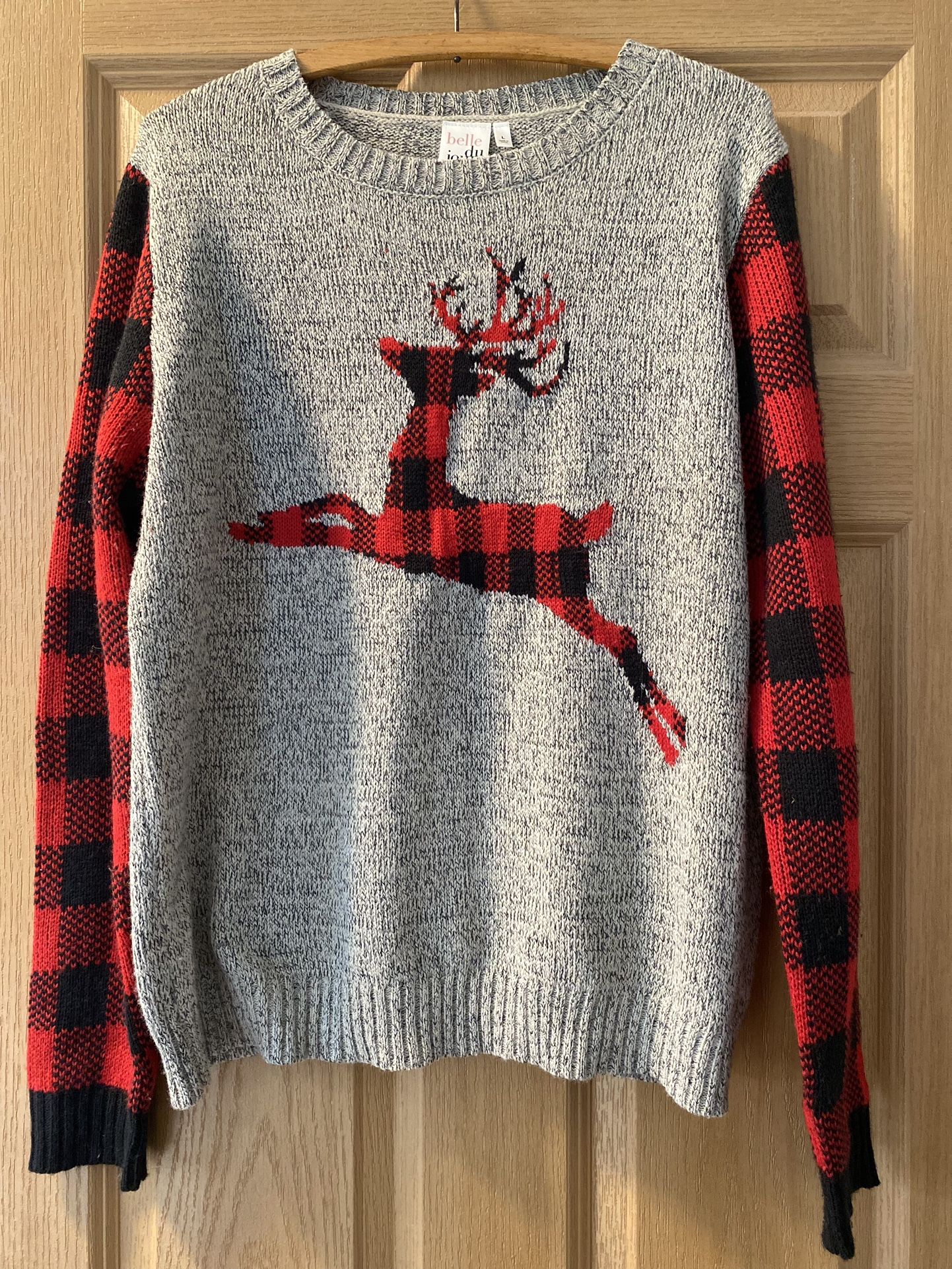 Christmas Sweater - Gray w/ Red & Black Buffalo Check Plaid Reindeer and Sleeves - Holiday Top Women’s Size Large Bella Du Jour Ugly Christmas Sweater