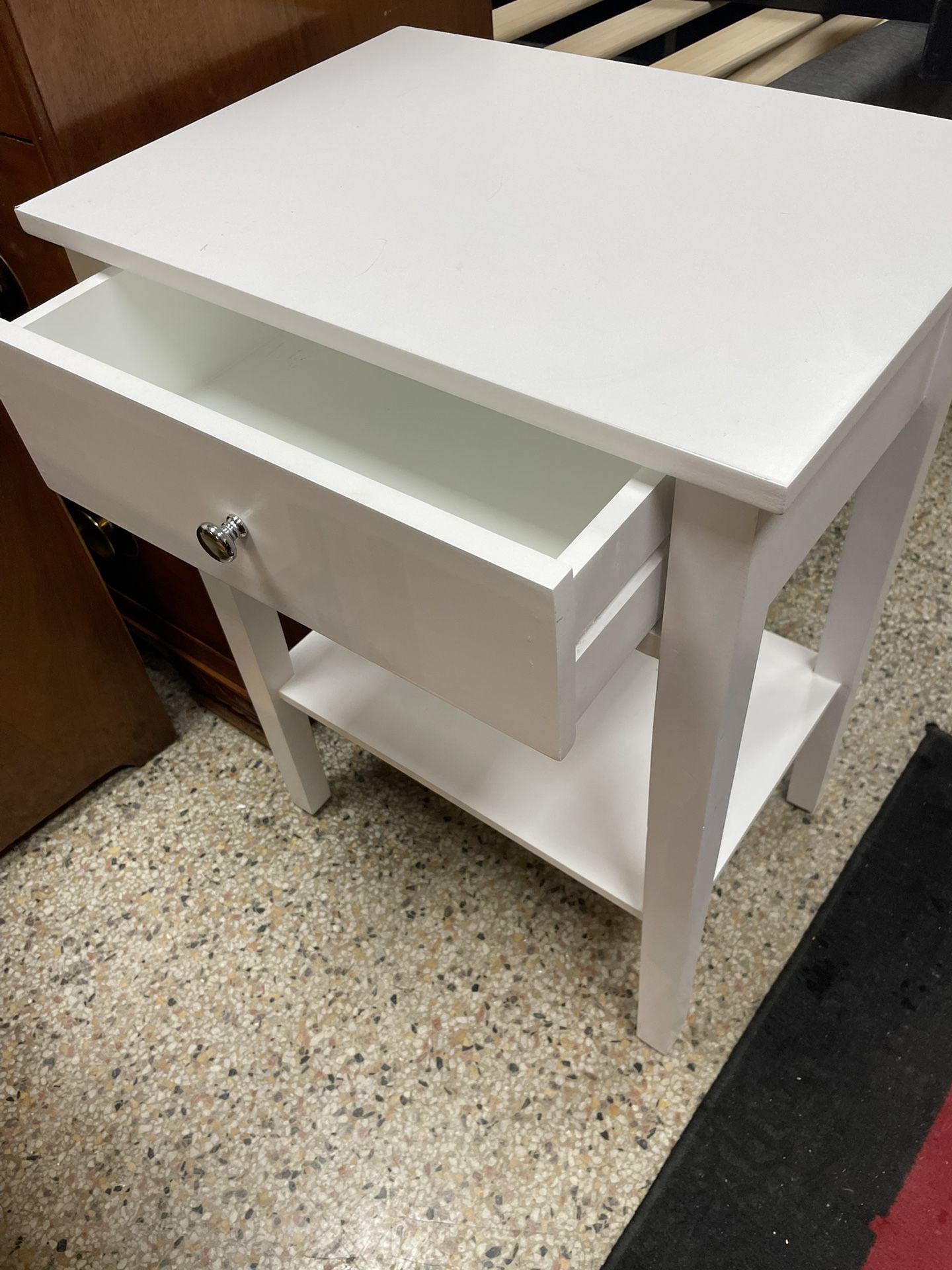 1 White Bed Nightstand End Table with drawer and lower shelf 20" W x 26 3/4" H x 14 3/4" D x 12" shelf space. Small lamp included if you want. Habla Español