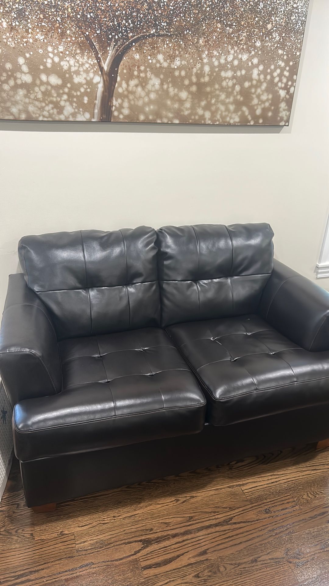 For sale is a leather love seat and chair sofa with ottoman from Ashley furniture asking 550 obo