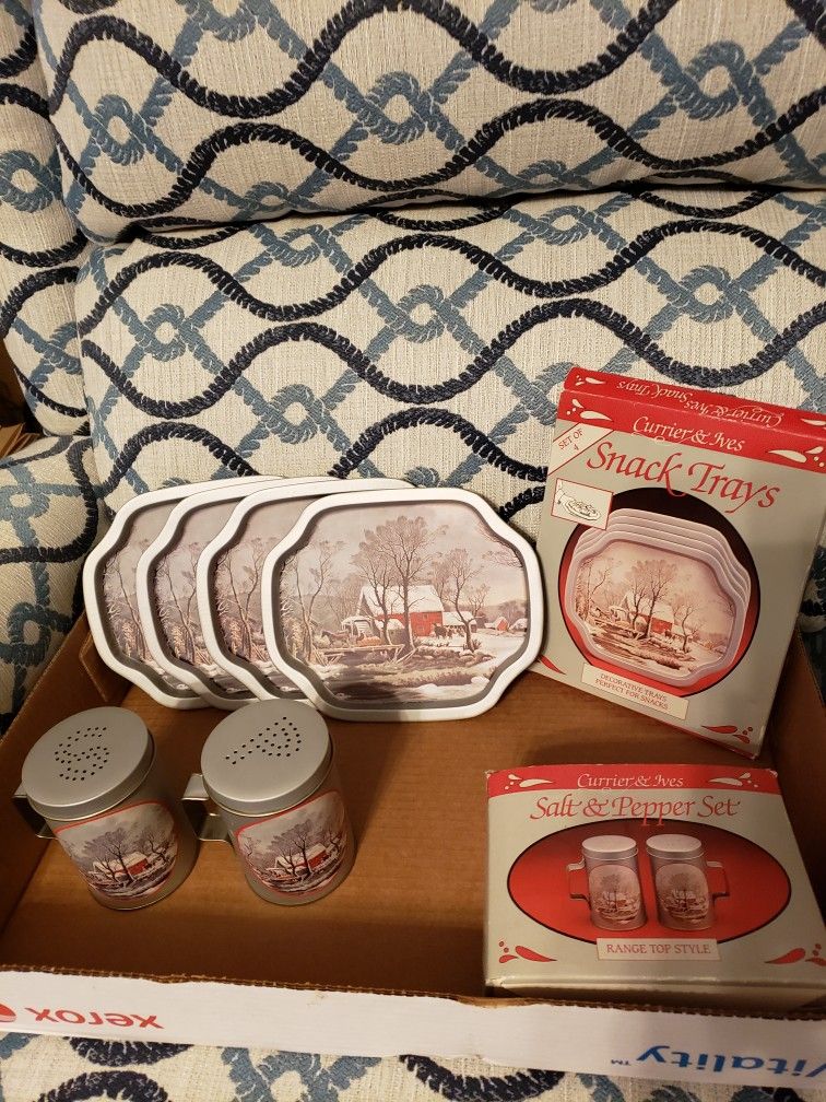 Nostalgic Currier & Ives print on metal snack trays (4) and salt/pepper shakers. New in boxes.