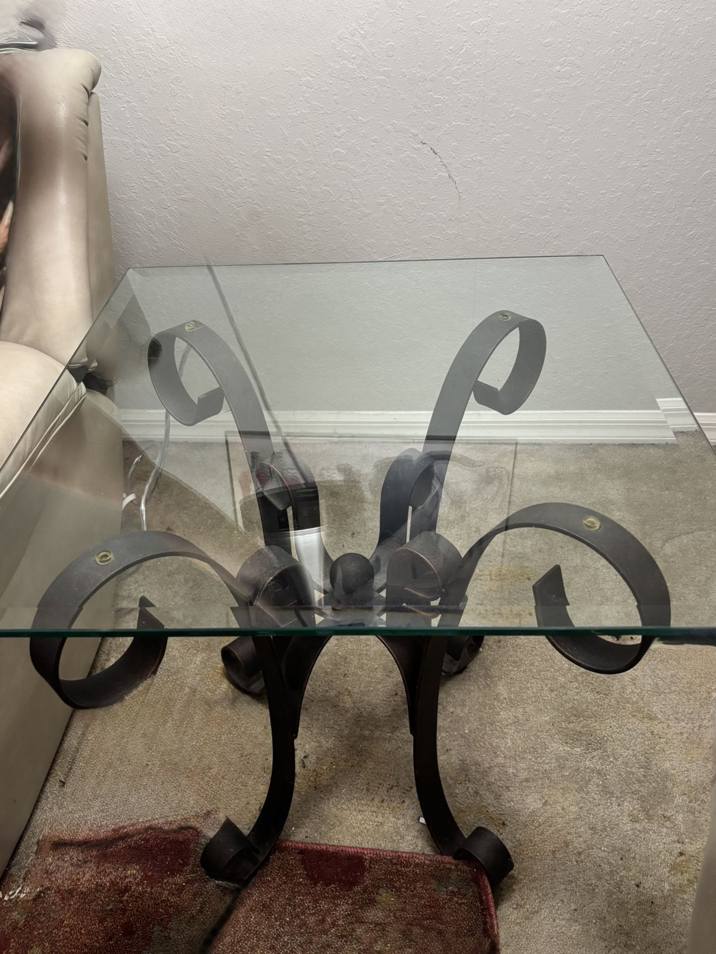 The coffee table and end tables look brand new. Coffee table glass is 4’2.5” x 2.2’ 1/2” End table glass is 2’ x 2’
