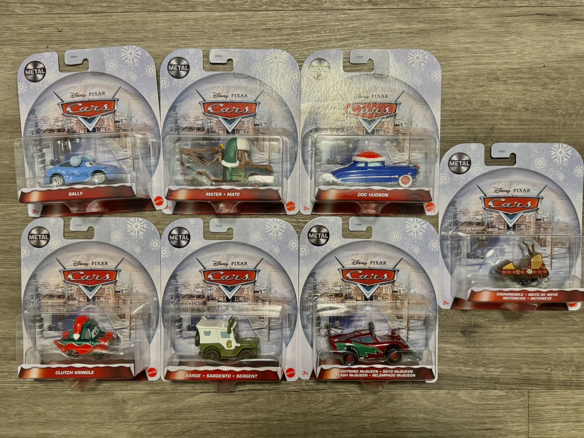 Includes Holiday Characters As Pictured: McQueen with Plow, Mater, Sarge, Sally, Doc Hudson, Clutch Kingle, Snowmobile. All New, In Great Condition.