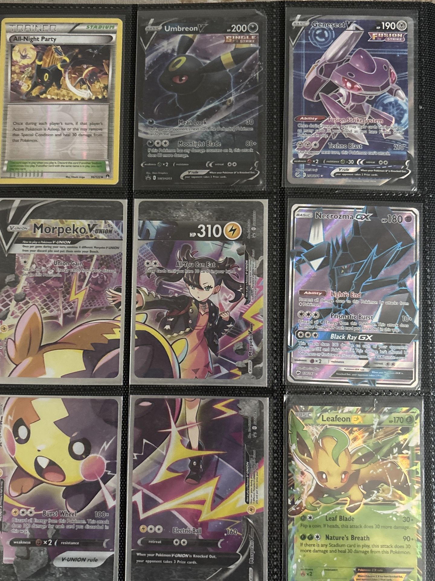 🔥 Pokémon Cards Lot 16 (Singles Available) 🔥 ✨ Cards Included NM 1. 🌙 All-Night Party — BREAKpoint 96/122 Reverse — $6.09 2. 🦊 Umbreon V — SWSH203 Promo — $2.81 3. 🤖 Genesect V (Full Art) — Fusion Strike 254/264 — $2.66 4. ⚡ Morpeko V-UNION (Set of 4) — SWSH287–290 Promos — $6.00 5. 🌌 Necrozma GX (Full Art) — Burning Shadows 134/147 — $3.80 6. 🍃 Leafeon EX — Generations 10/83 — $25.24 ⸻ ⚠️ Disclaimer: Prices based on NM comps (TCGplayer, eBay solds, PriceCharting). Market shifts daily; items may be priced differently depending on demand. Open to trades & fair offers. #Pokemon #PokemonCards #PokemonTCG #CaliLifeTCG #Umbreon #Leafeon #Morpeko #Genesect #Necrozma