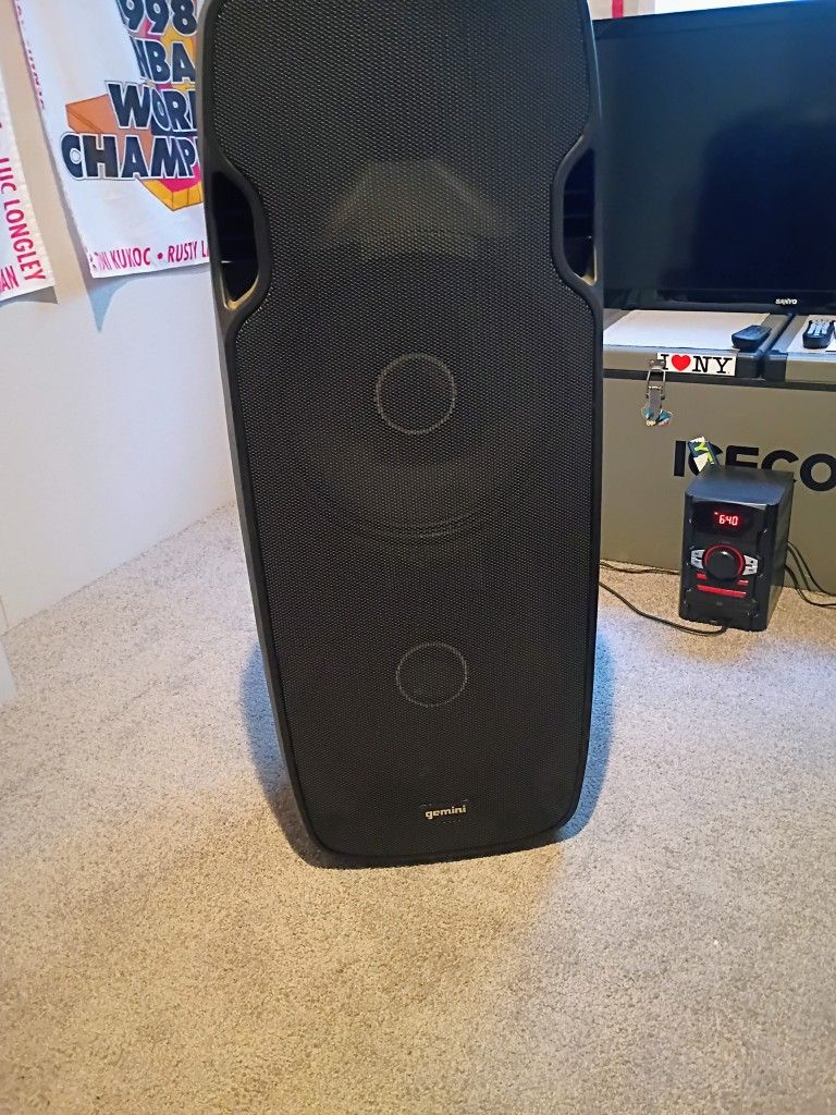 Gemini party speaker....radio, Bluetooth, auxiliary, very very very loud!!! With colored led lights around speakers! Very rarely used! 275 obo