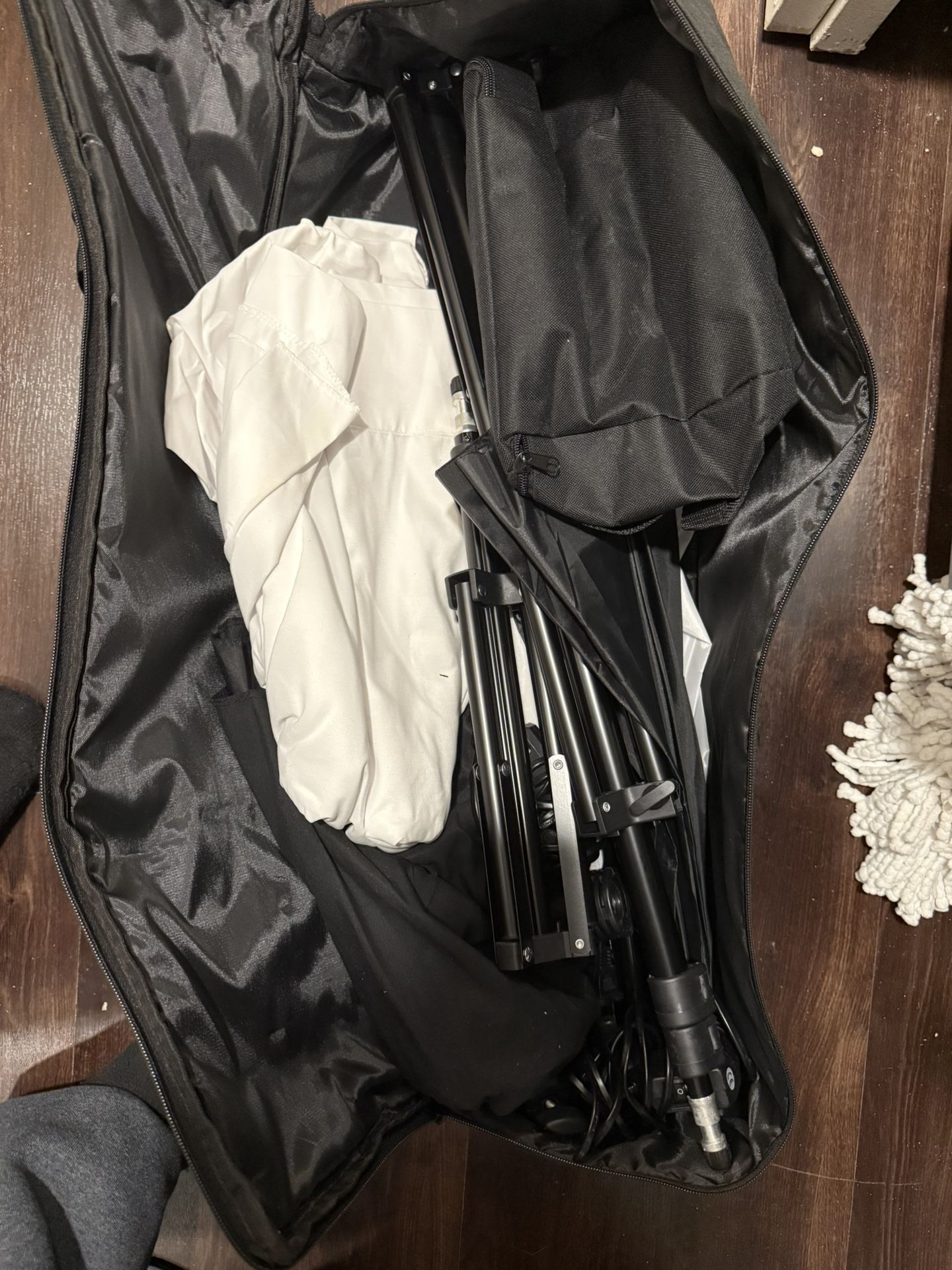 Complete studio lighting kit for portrait photography or video recording The Professional Umbrella Lighting kit is to provide prefect shooting light, to satisfy high requirement of shooting light (3) x 45W 5500K Energy-Saving lamps Continuous Photography (CFL) (3) x single-head support lamp (2) x 83 inch and (1) x 33 inch photographic light holder 1 bulb transport bag. 1 sturdy transport housing. Store the entire tool kit Goes on Amazon for $70. Selling for $50 obo