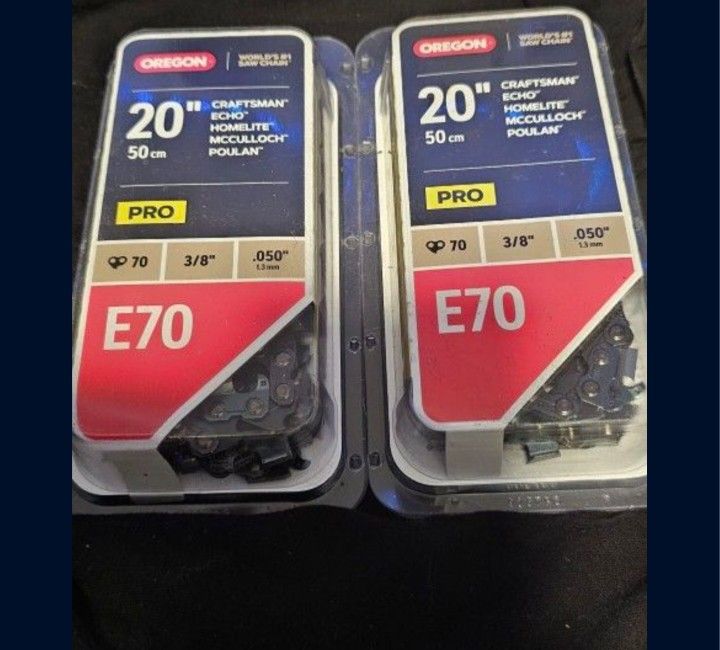 2-Pack Oregon E70 Chainsaw Chain 20" - Bundle Deal Keep your chainsaw cutting smoothly with this 2-Pack of Oregon E70 Chainsaw Chains for 20-inch bars. These are brand new in original packaging, designed for professional performance and long-lasting durability. Bundle Includes: 2 Oregon E70 Chainsaw Chains Fits 20" (50 cm) Bars 3/8" Pitch, .050" Gauge (1.3mm), 70 Drive Links Compatible with Craftsman, Echo, Homelite, McCulloch, Poulan, Makita, Skil, and others Bundle Deal Both for the price of one! (Retail price: $24.98 each — Get both for just $25!) Perfect for pros or DIYers who want to stock up and save. Brand new and ready to ship!