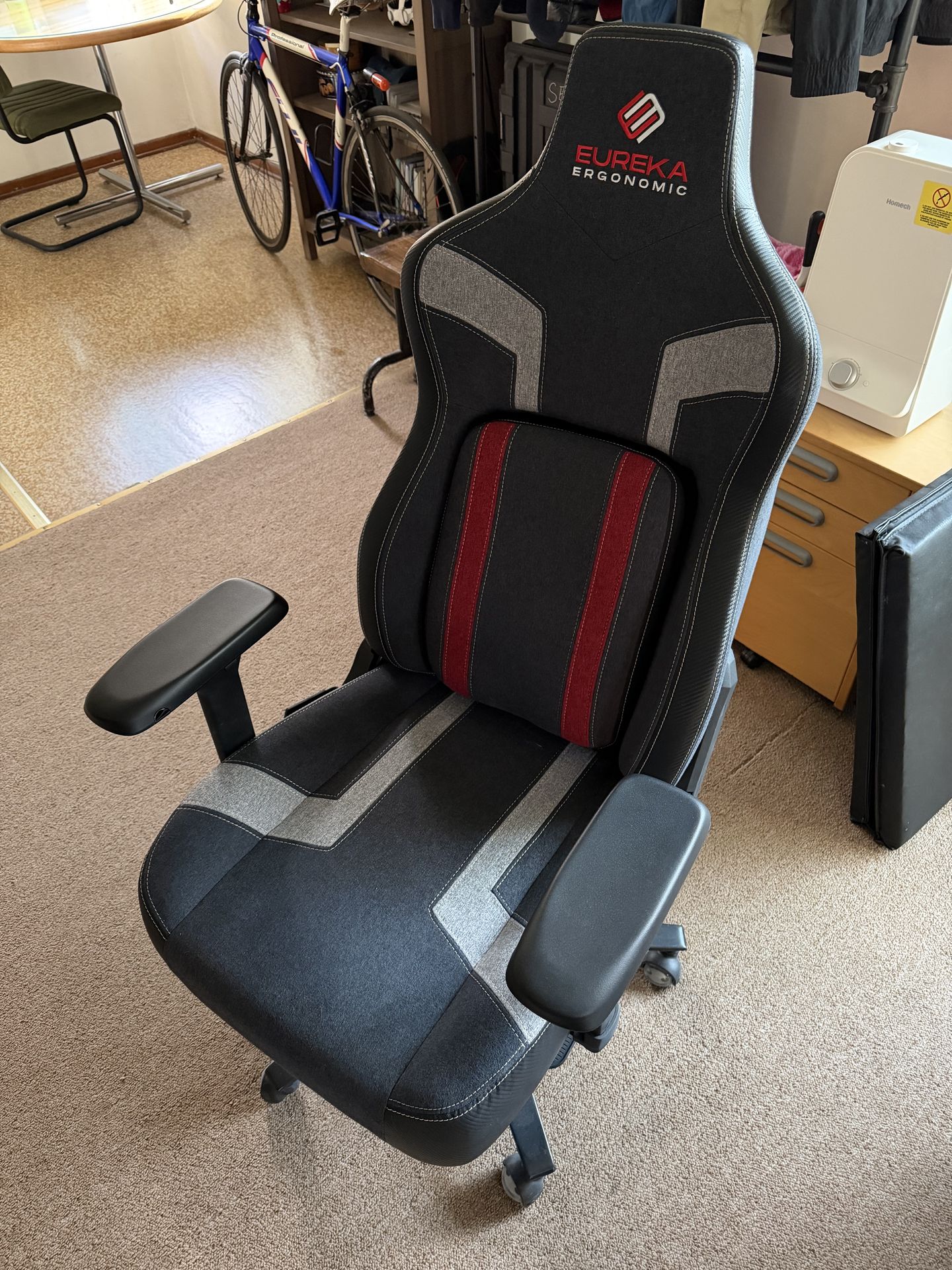 Eureka Ergonomic Python II gaming chair in gray with red accents. Comfortable, supportive, and fully adjustable. Includes lumbar support cushion as shown. All adjustments work properly including height adjustment, recline, swivel, and smooth rolling base. Structurally solid and ready to use. Pickup only in Alhambra.