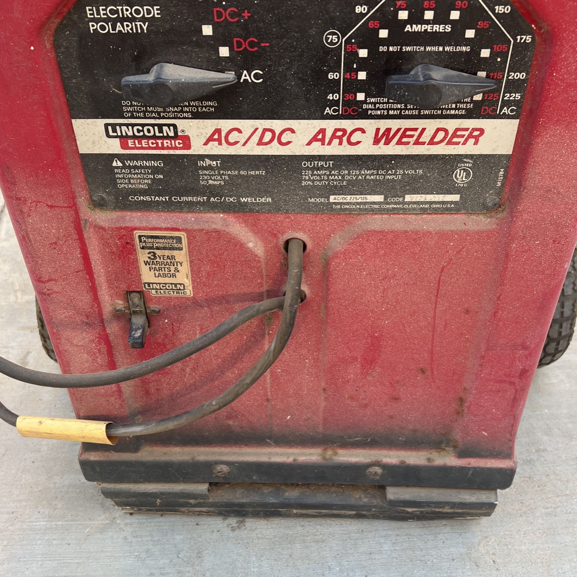 LINCOLN ELECTRIC AC/DC ARC WELDER ELECTRODE POLARITY 225 AMPS AC OR 125 AMPS DC AT 25 VOTS 79VOTS MAX OCV At RATED INPUT 20%DUTY CYCLE with dolly attachment with  75 feet cable $380 pick up in Rialto
