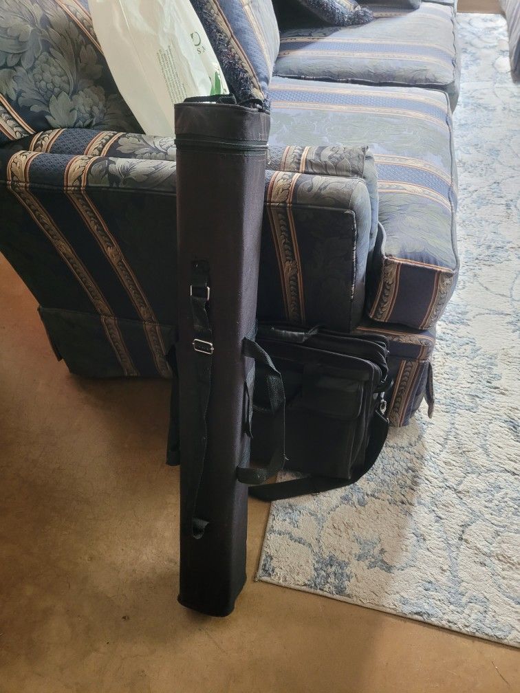Water Resistant, Zipper and name tag pocked, has shoulder harness and handle. $25