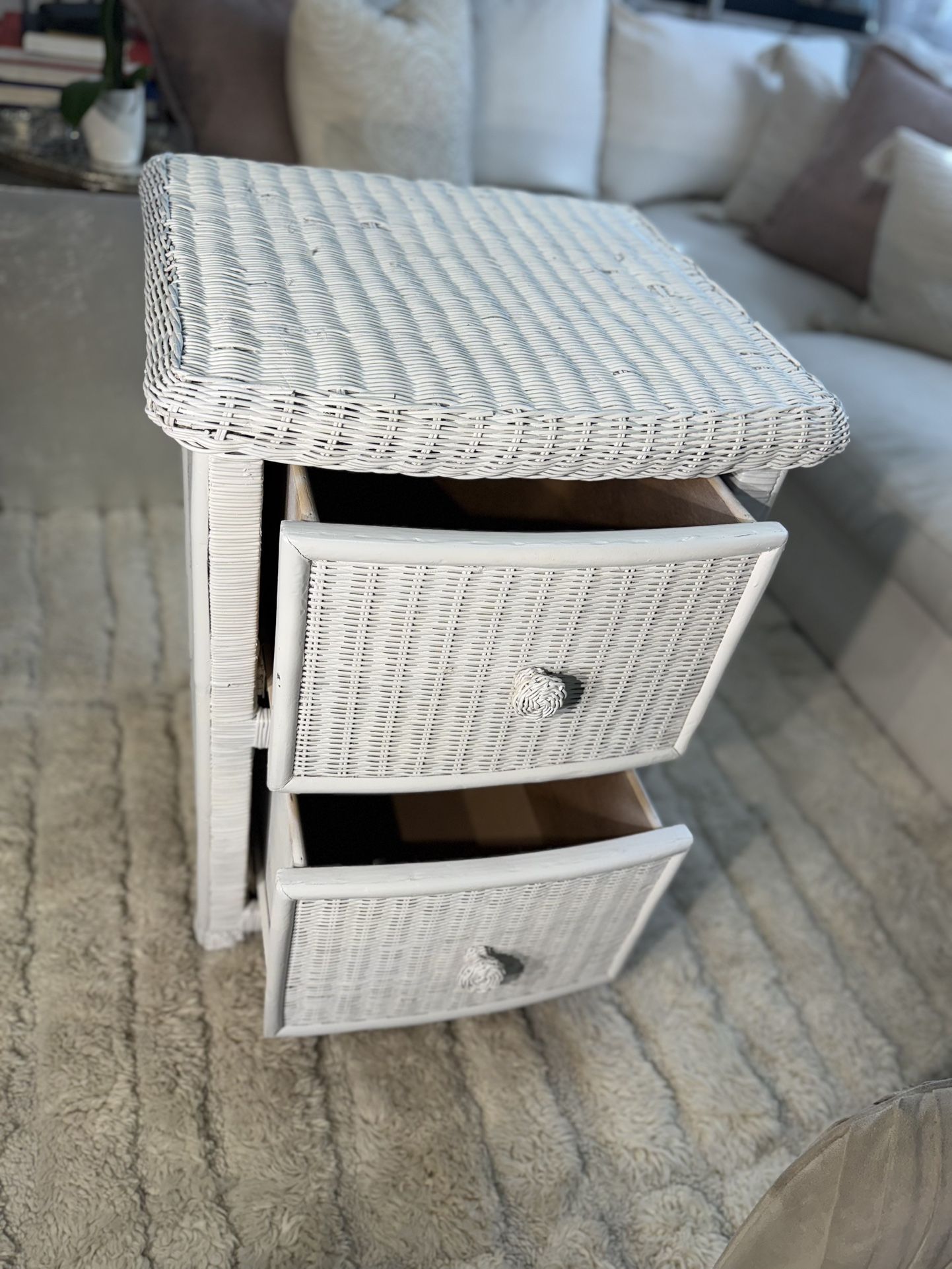 This gorgeous, white wicker nightstand can also be used as an end table. It is very sturdy and intended for indoor use. Both drawers work perfectly and have ample space for Storage.. The frame is made of solid wood so this piece is not super lightweight. ** Please note that lighting may affect the color. However, this piece of furniture is white. Measurements 22" L x 22" W x 29" H Available for pick up immediately. Delivery is also an option for an additional fee depending on location. Message me with any questions.