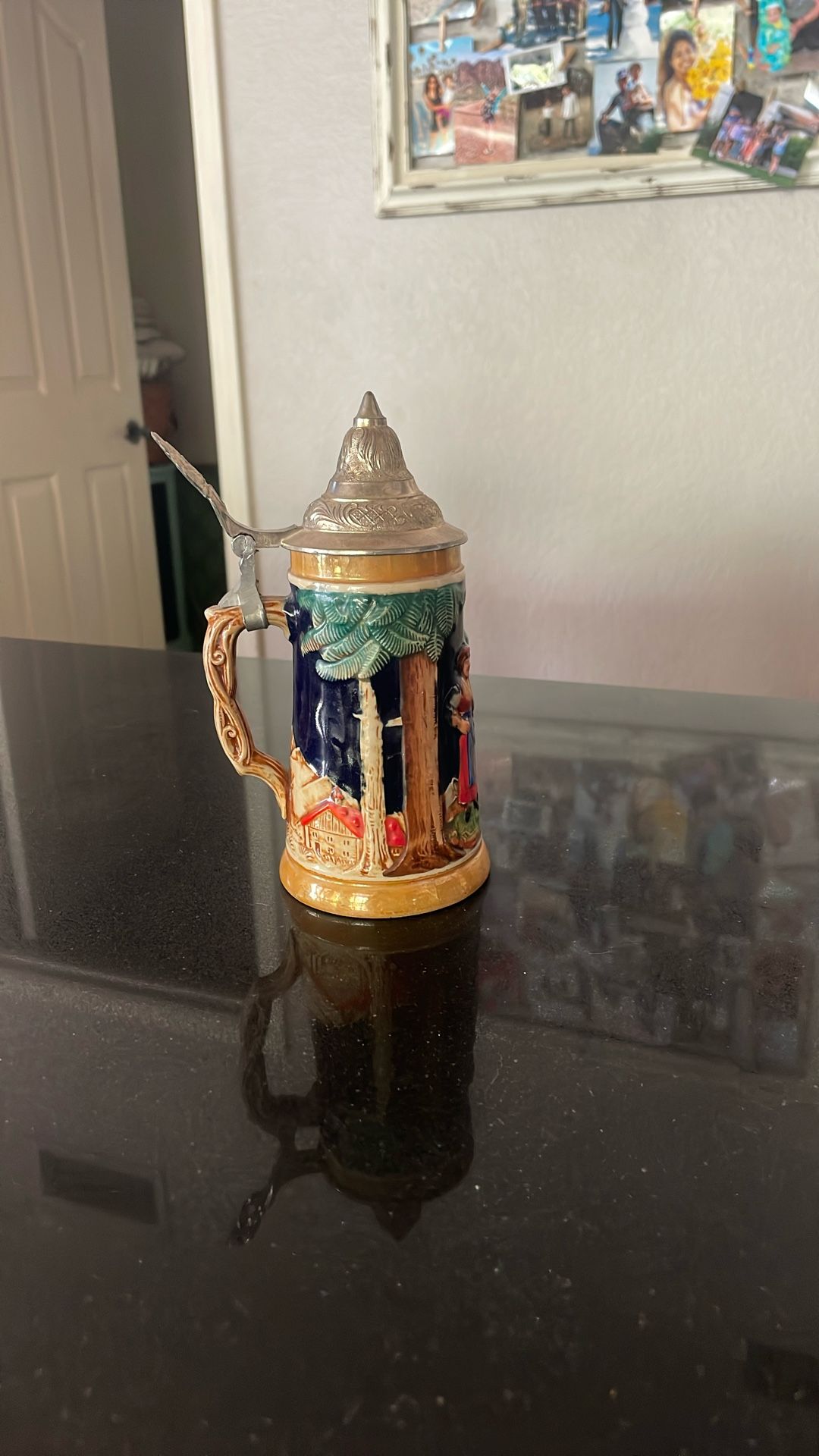 7 inch beer stein made in Germany with Pewter lid. Initials DBGM on inside of lid
