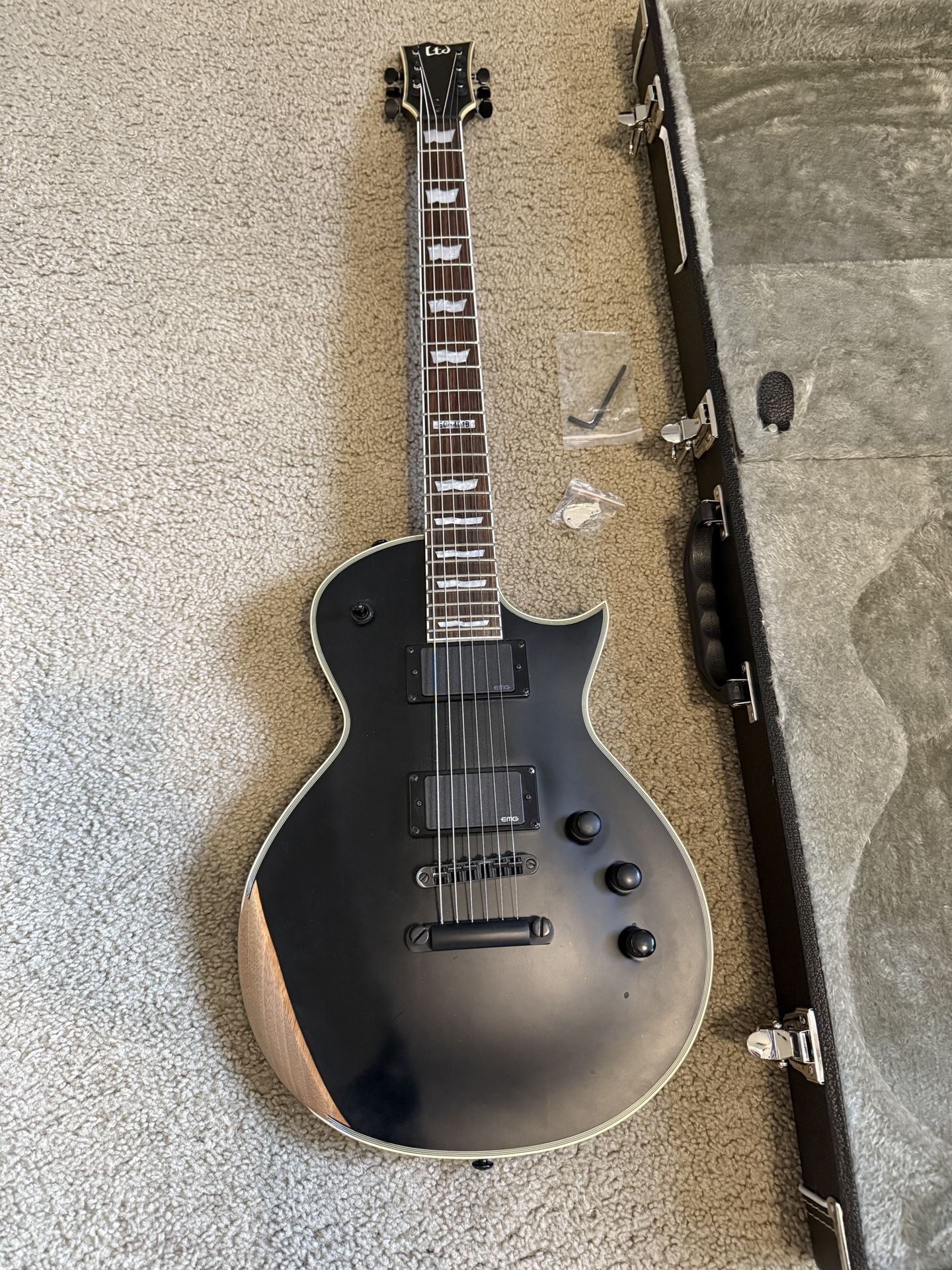 For sale is an ESP LTD EC-401B Baritone Electric Guitar in Satin Black with a form fitting hardshell case. Cash Payoff, No Trades, No Delivery, As is Sale