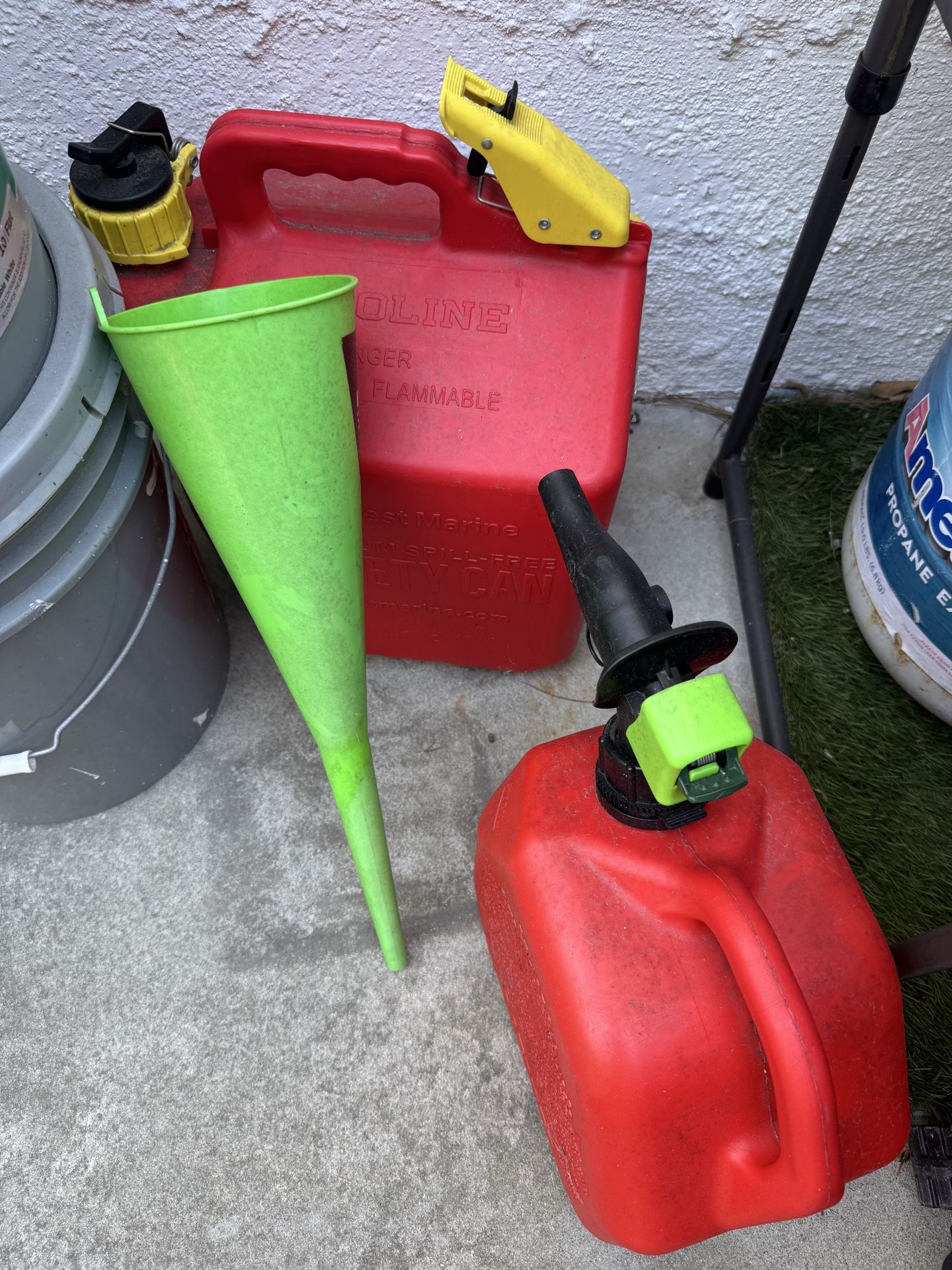 Gas Cans + Funnel Set – Spill-Proof, Ready to Use Selling a set of durable gas cans in good working condition. Perfect for lawn equipment, generators, boats, or emergency fuel storage. Included: • (1) Larger red gas can (approx. 5 gallons) with nozzle • (1) Smaller red gas can (approx. 2–2.5 gallons) with spill-proof spout • (1) Green funnel for easy filling Features: • Spill-resistant nozzles • Sturdy plastic construction • Easy-grip handles • Clean and fully functional Condition: Used but in solid condition, no leaks Asking $15 for both 📍 Pickup in Huntington Beach Cash only please.