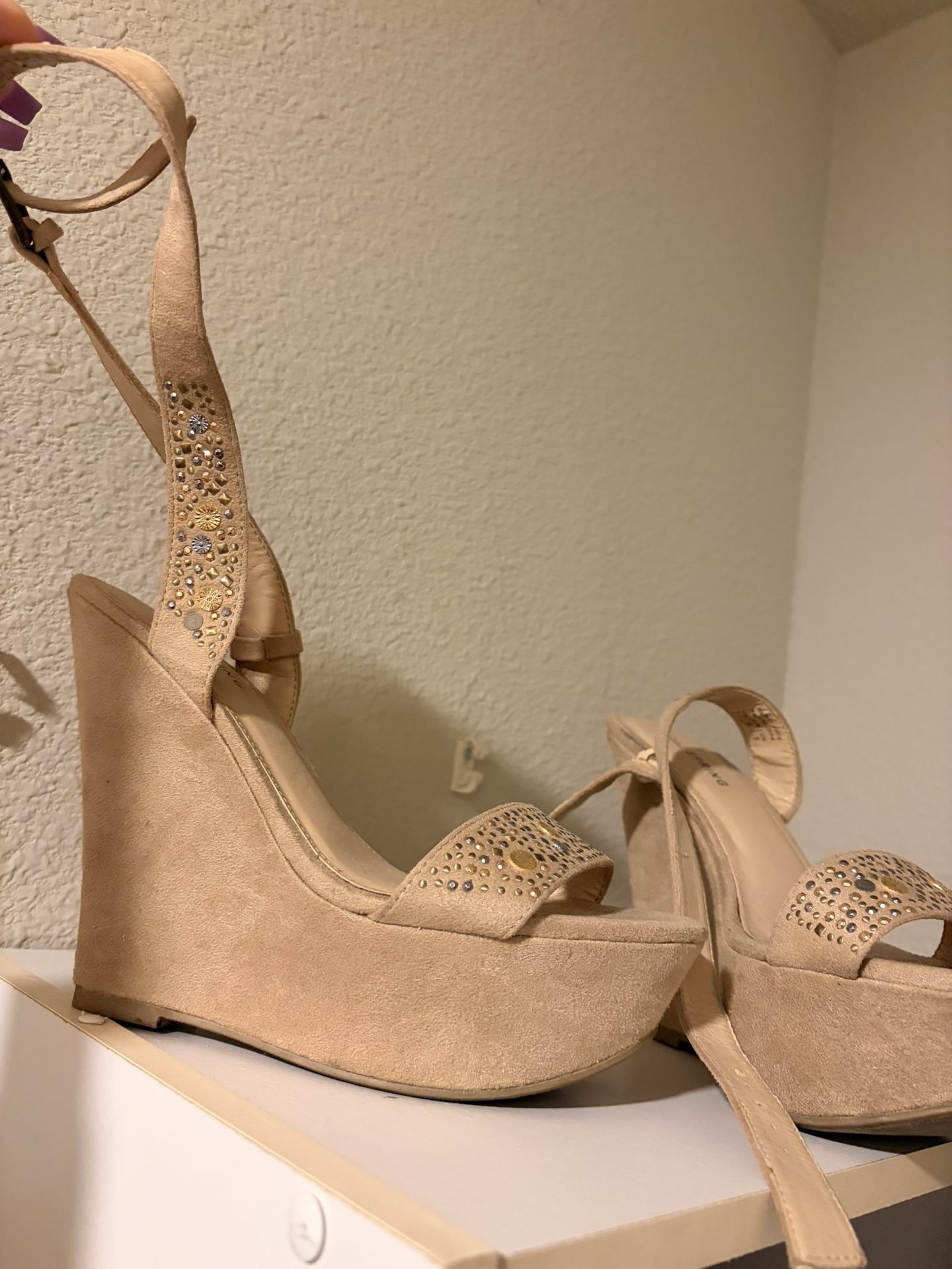 Beige/nude wedges. Size 7 1/2. Long strap with sparkles on the strap & the toe strap.
