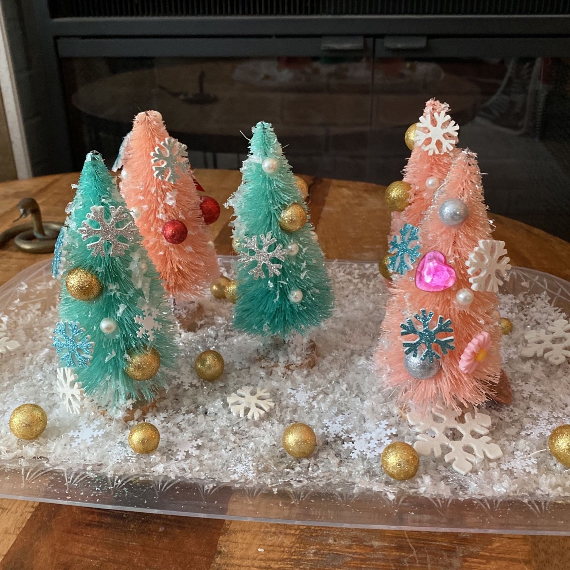 Christmas winter theme, bristle brush trees with sparkly snow and snowflakes on a plastic tray. Decorated in a fun anime style. Made by me!