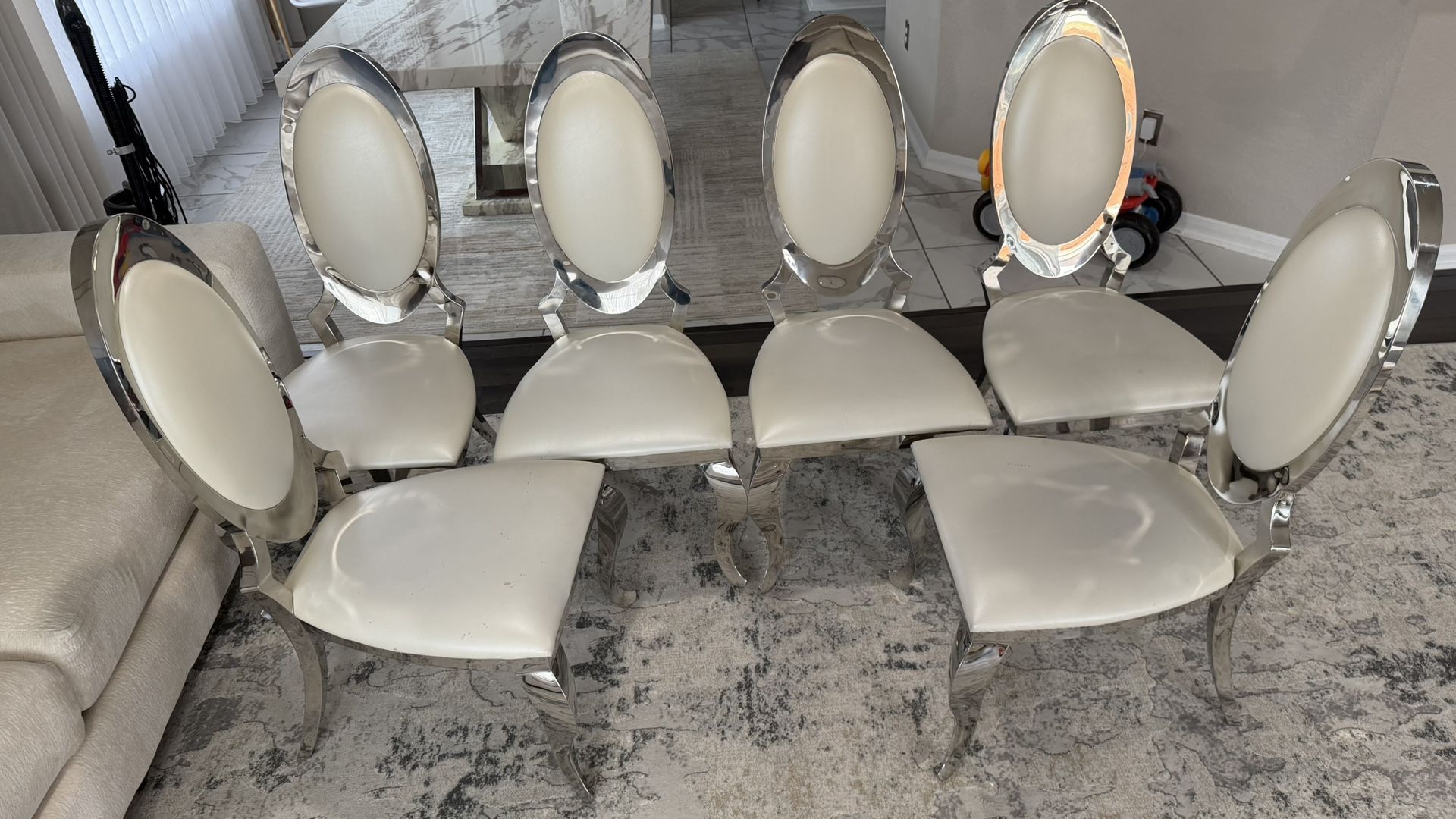 White leather dining chairs, a few of them have scratches but other than that in a very good condition, very durable.